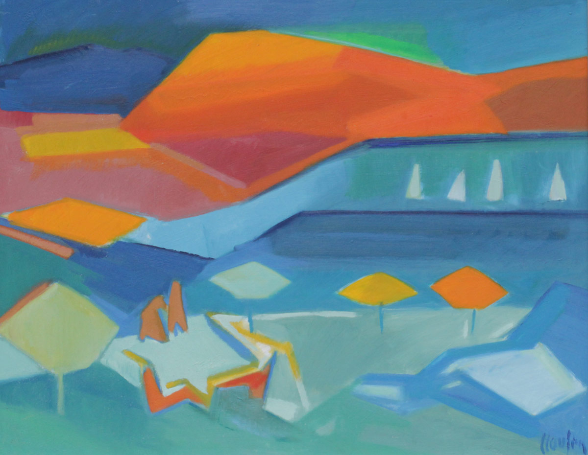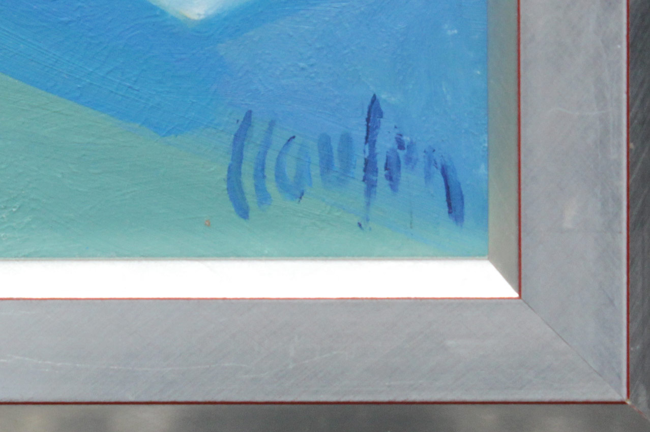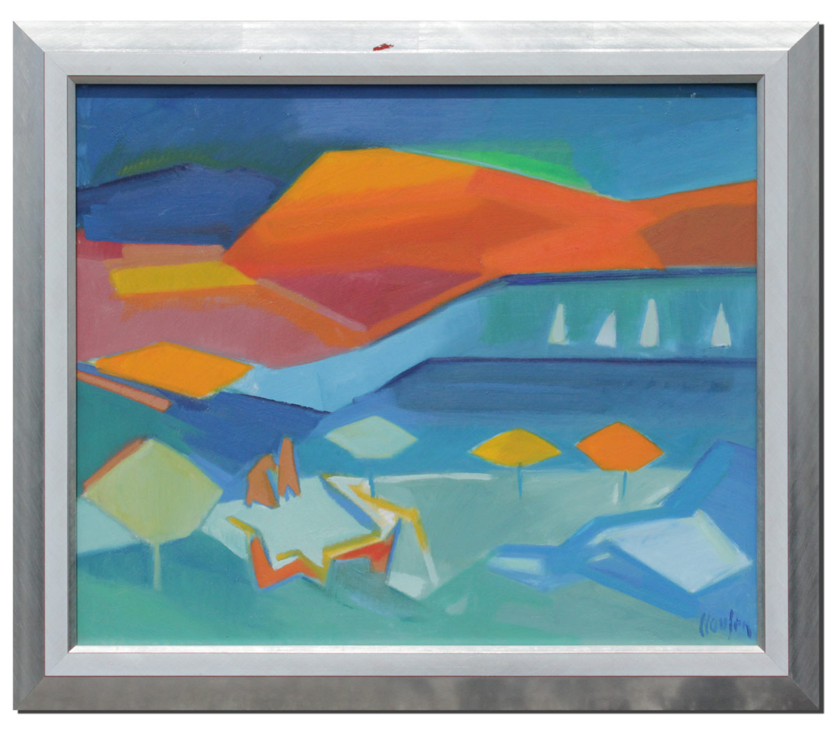 CLAUSEN, Henri, (Danish, 1909- ): Modernist Harbor Painting, Oil/Masonite, 20'' x 24'', signed lower right, custom silver gilt frame with minor wear 24'' x 28''.
