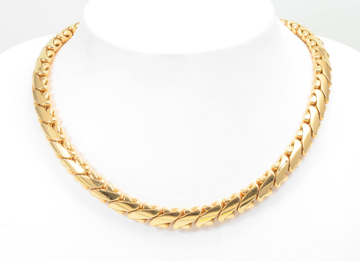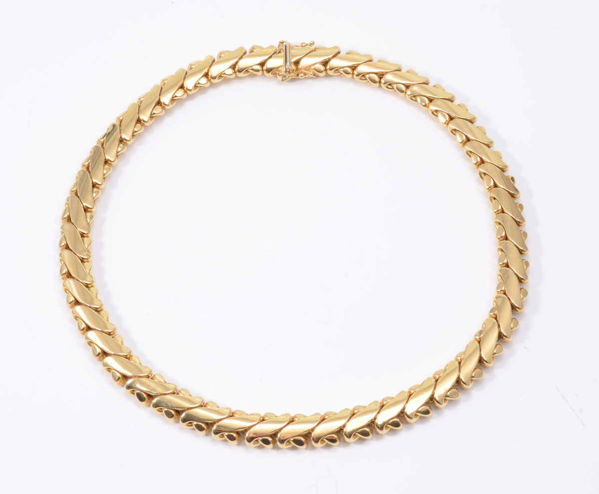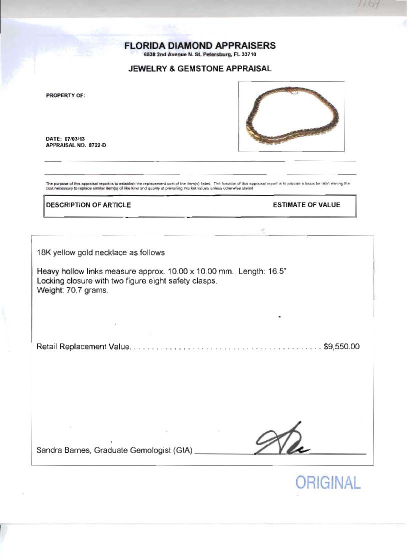 18K GOLD LINK NECKLACE: Heavy link necklace, the links being 10 x 10 mm. Length 16.5''. Locking closure with figure eight clasp. Weight 70.7 grams.
