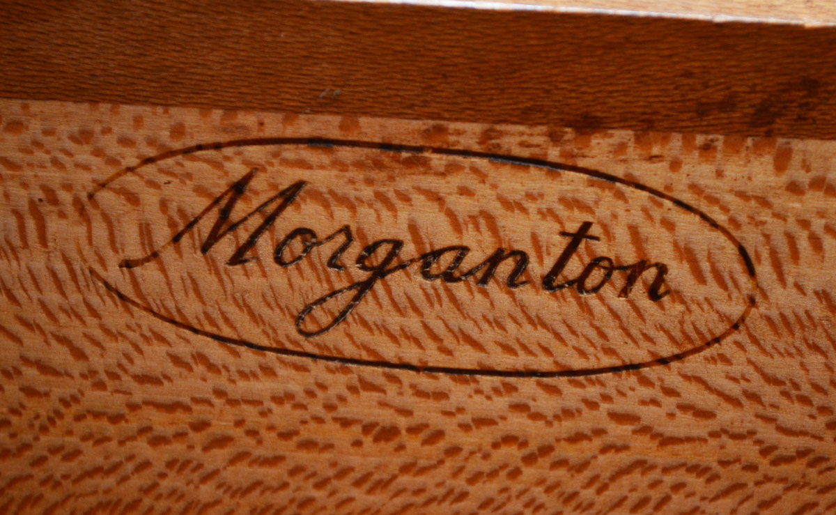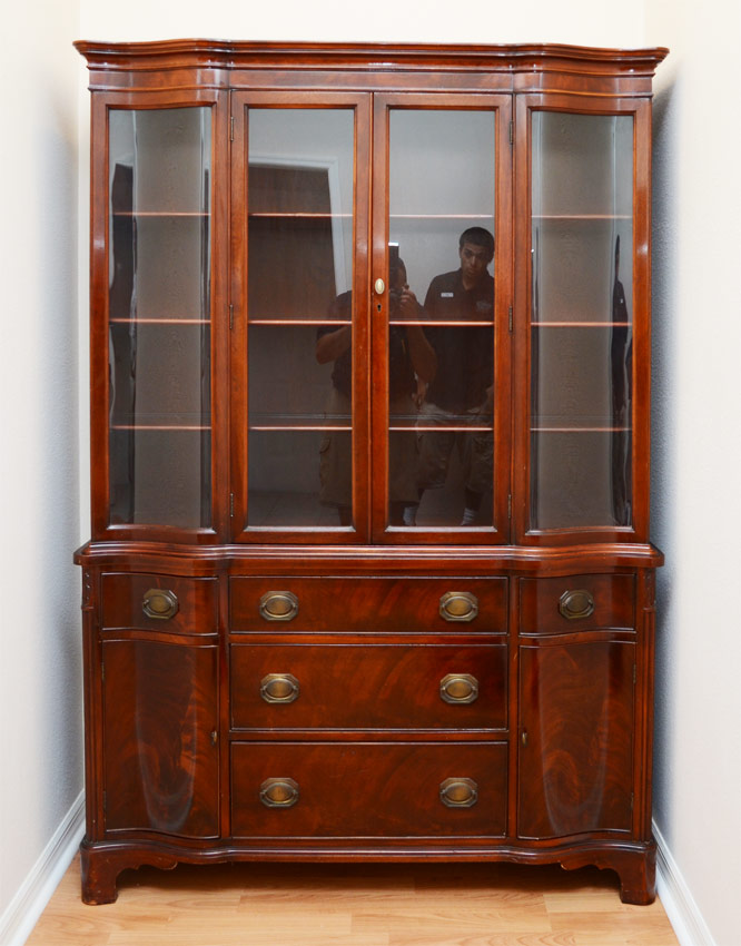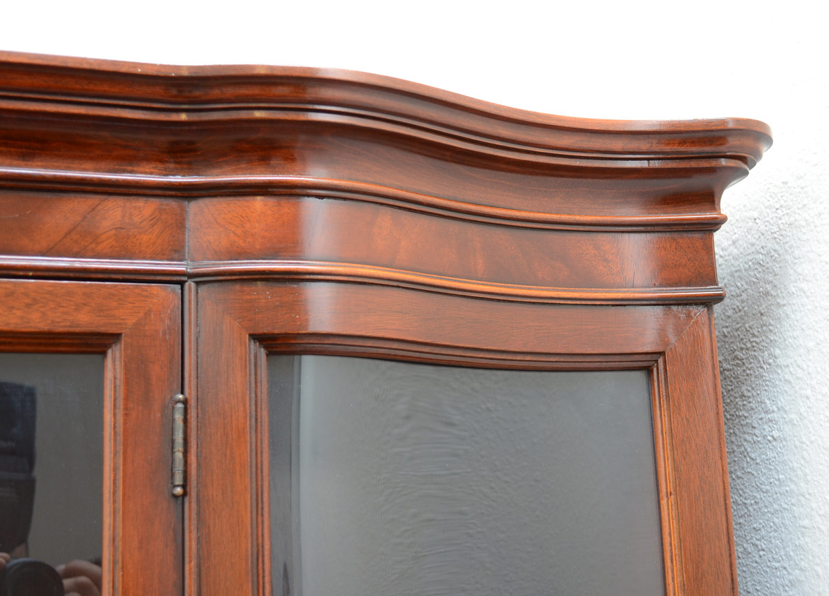 LARGE MORGANTON MAHOGANY SERPENTINE BREAKFRONT: Flame mahogany serpentine front with double curved side glass on top. 3 interior shelves. Base with 3 central drawers, 2 side drawers over 2 doors. 73 1/4'' h. x 52'' x 16''.