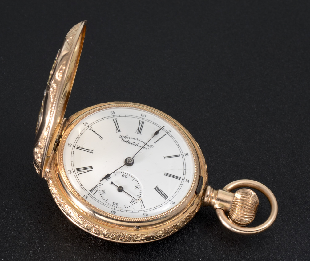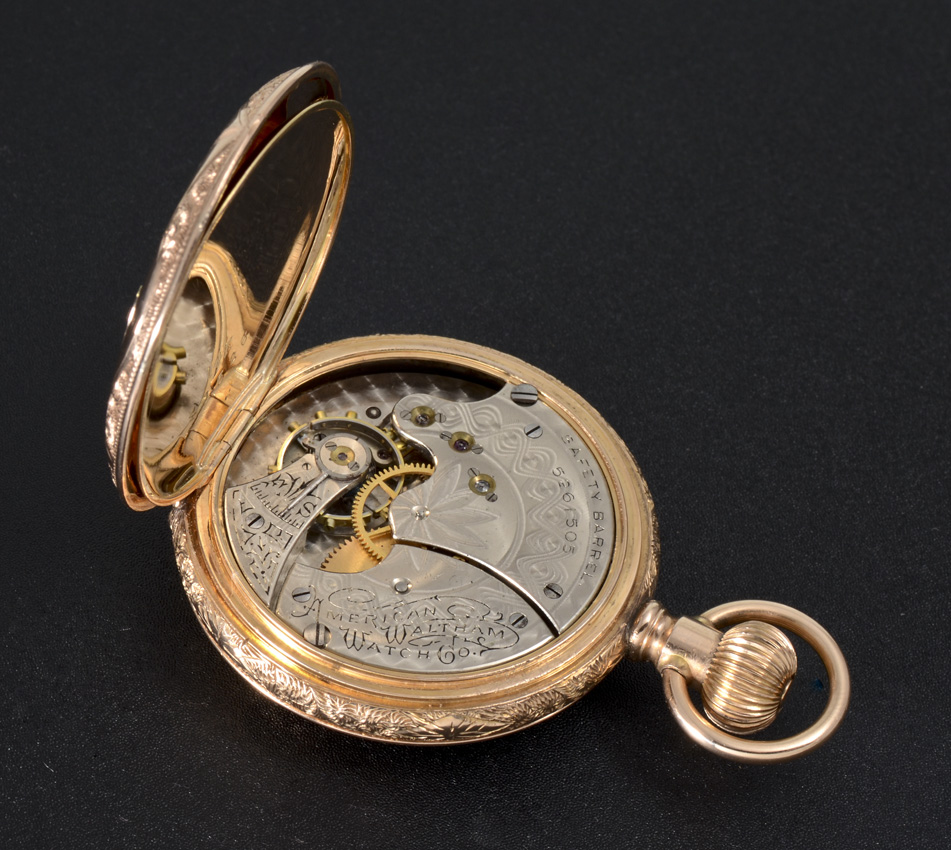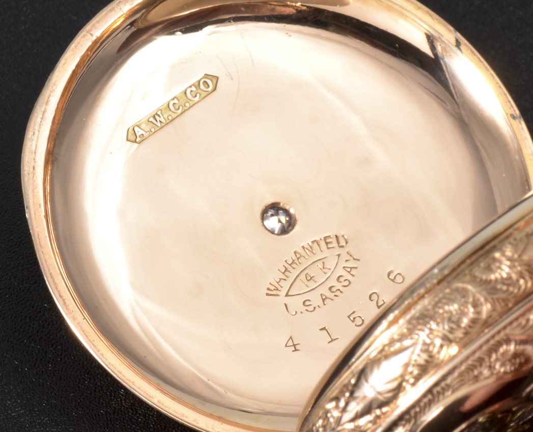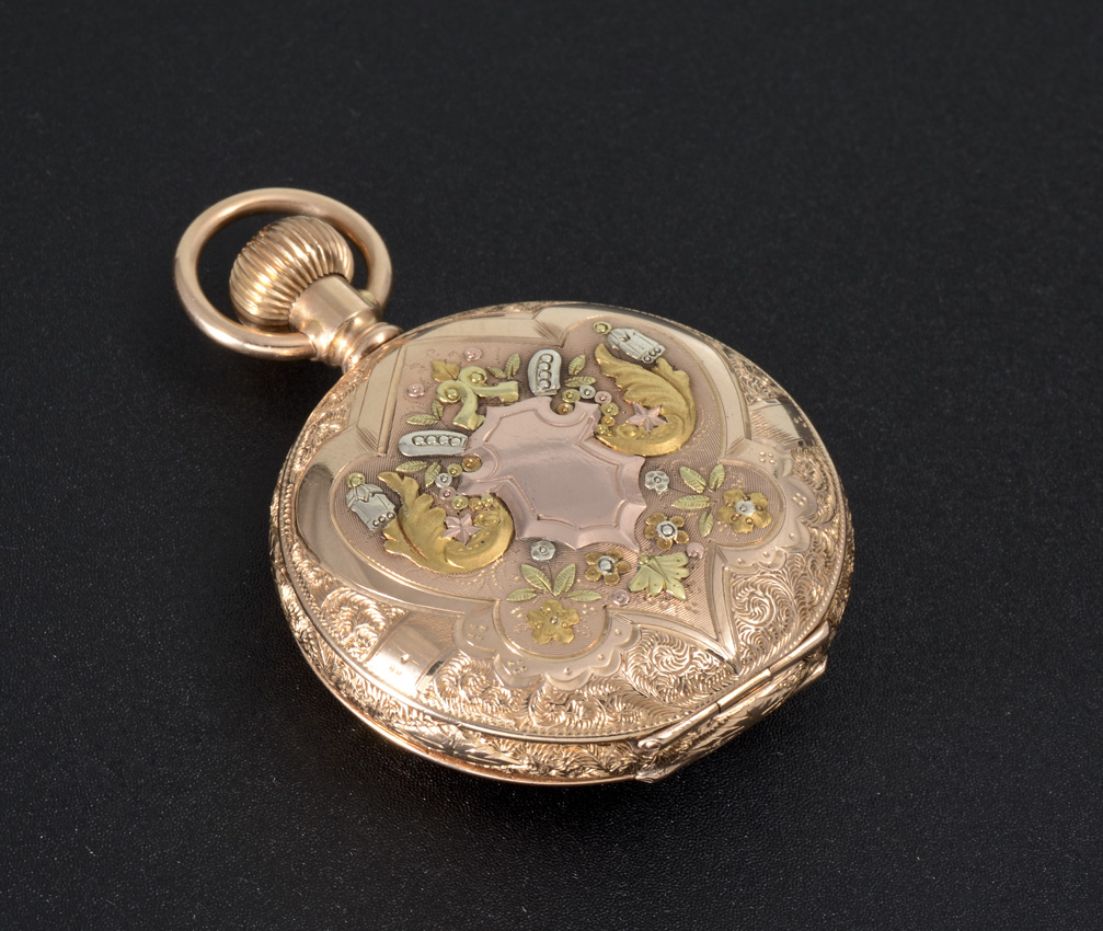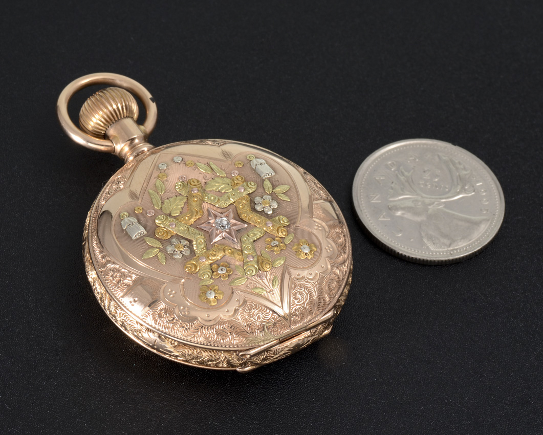 14K MULTI COLOR GOLD WALTHAM HUNTER CASE POCKET WATCH: Circa 1891, size 6 hunter case with diamond star, 11 jewel movement, pendant wind and set, serial #5261505.