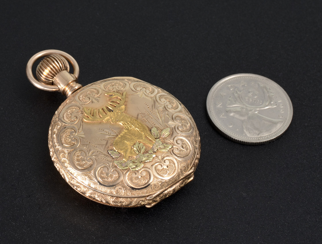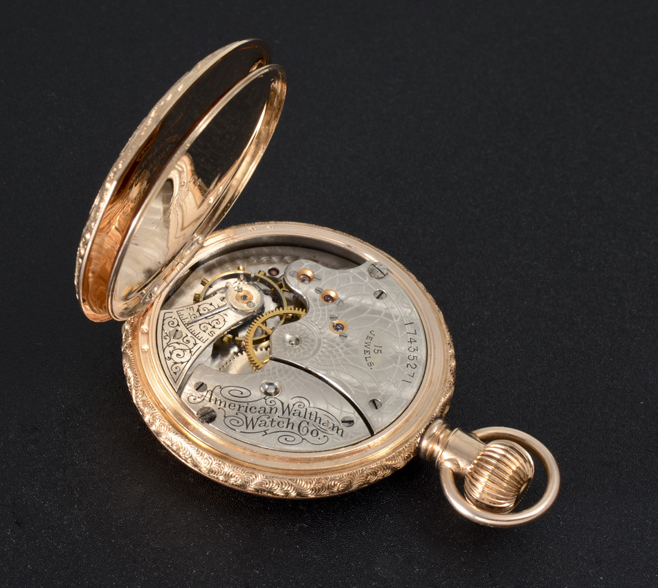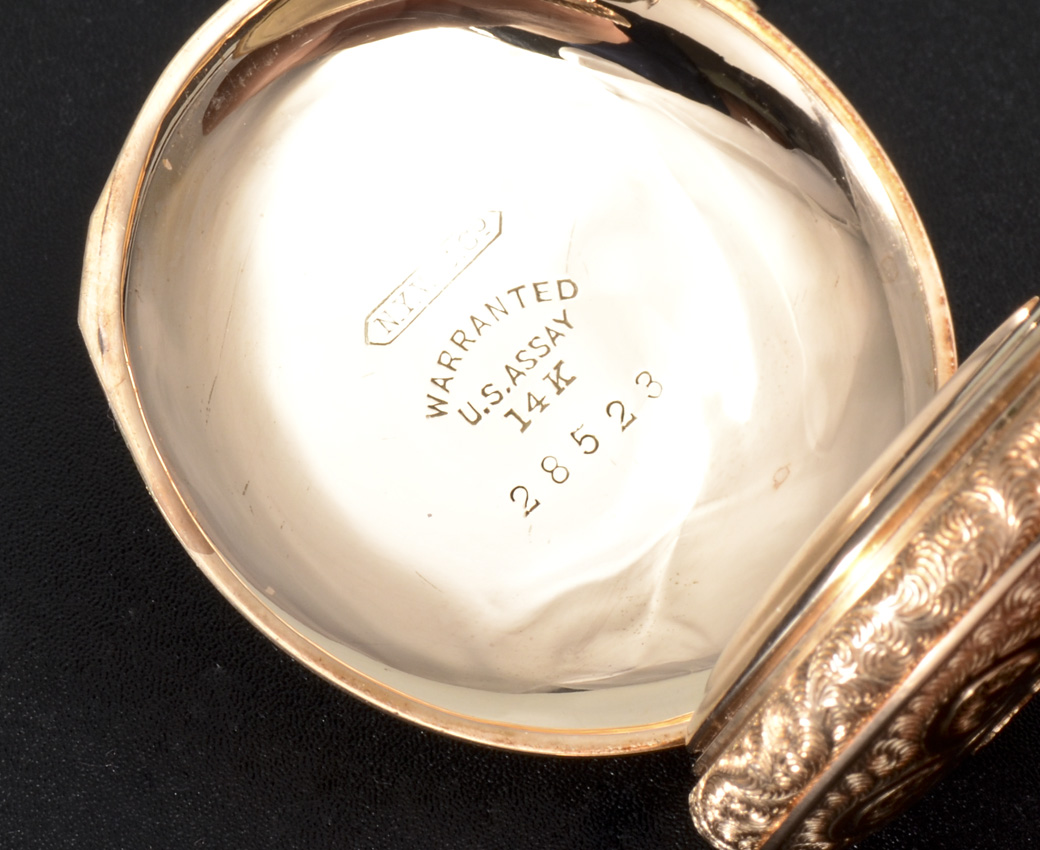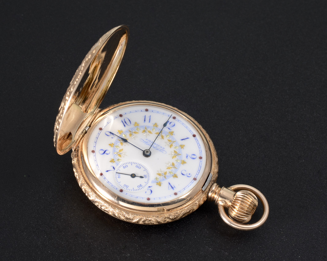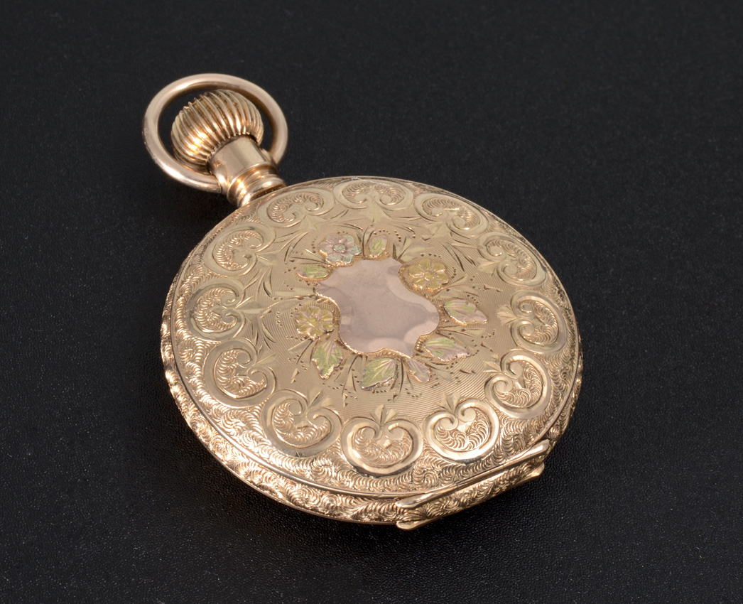 14K MULTI COLOR GOLD WALTHAM HUNTER CASE POCKET WATCH: Circa 1908, size 6 hunter case with fancy white blue and gold dial, red 5 minute dots, 15 jewel movement, pendant wind and set, serial #17435271.