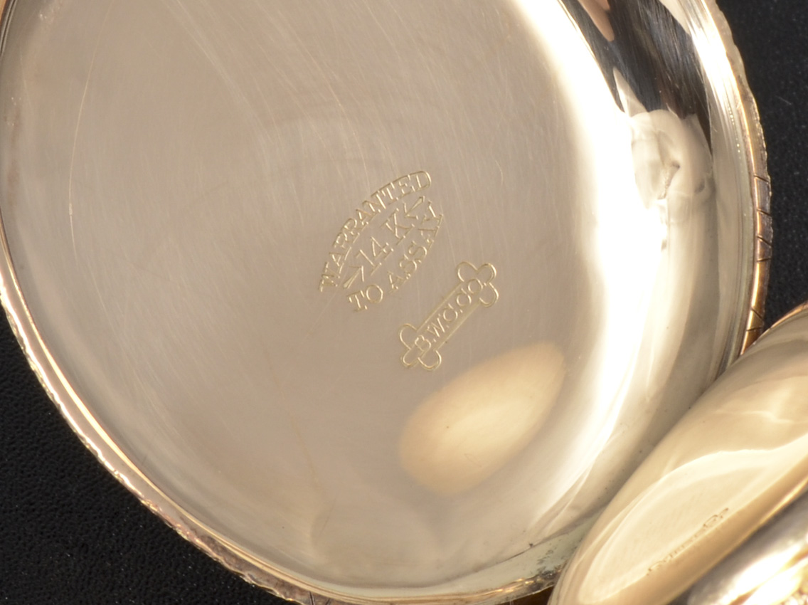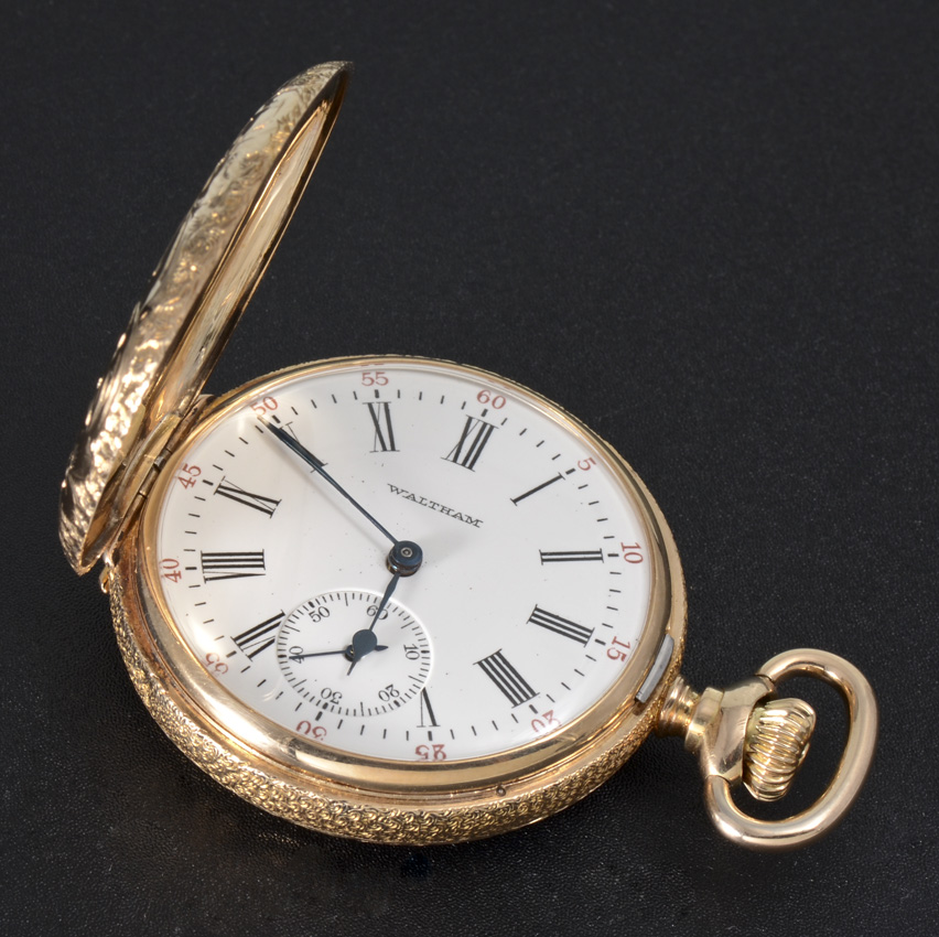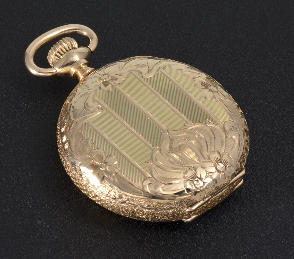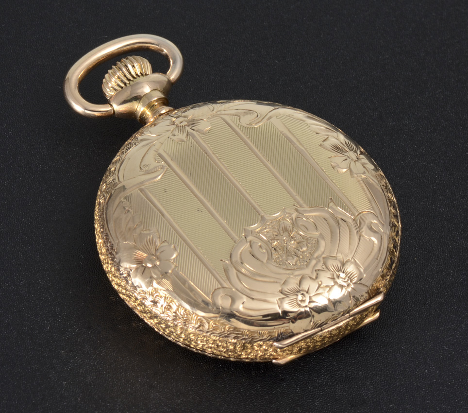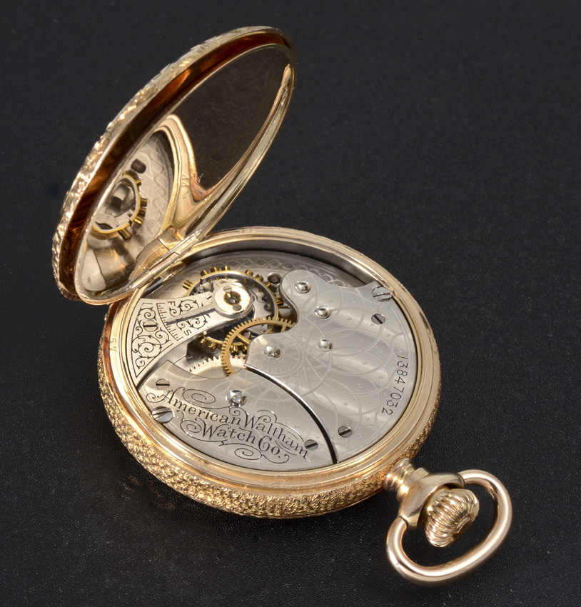 14K YELLOW GOLD WALTHAM HUNTER CASE POCKET WATCH: Circa 1904, size 6 hunter case with vertical stripes, 15 jewel movement, pendant wind and set, serial #13847032.