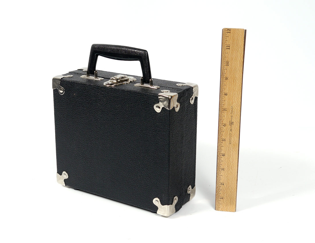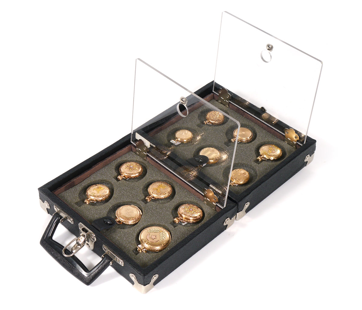 POCKET WATCH CARRYING CASE BY CAROLINA CASE COMPANY: Fitted to hold 12 pocket watches. Metal mounted hard case with handle. 3 3/4'' x 8'' x 9 1/2''.