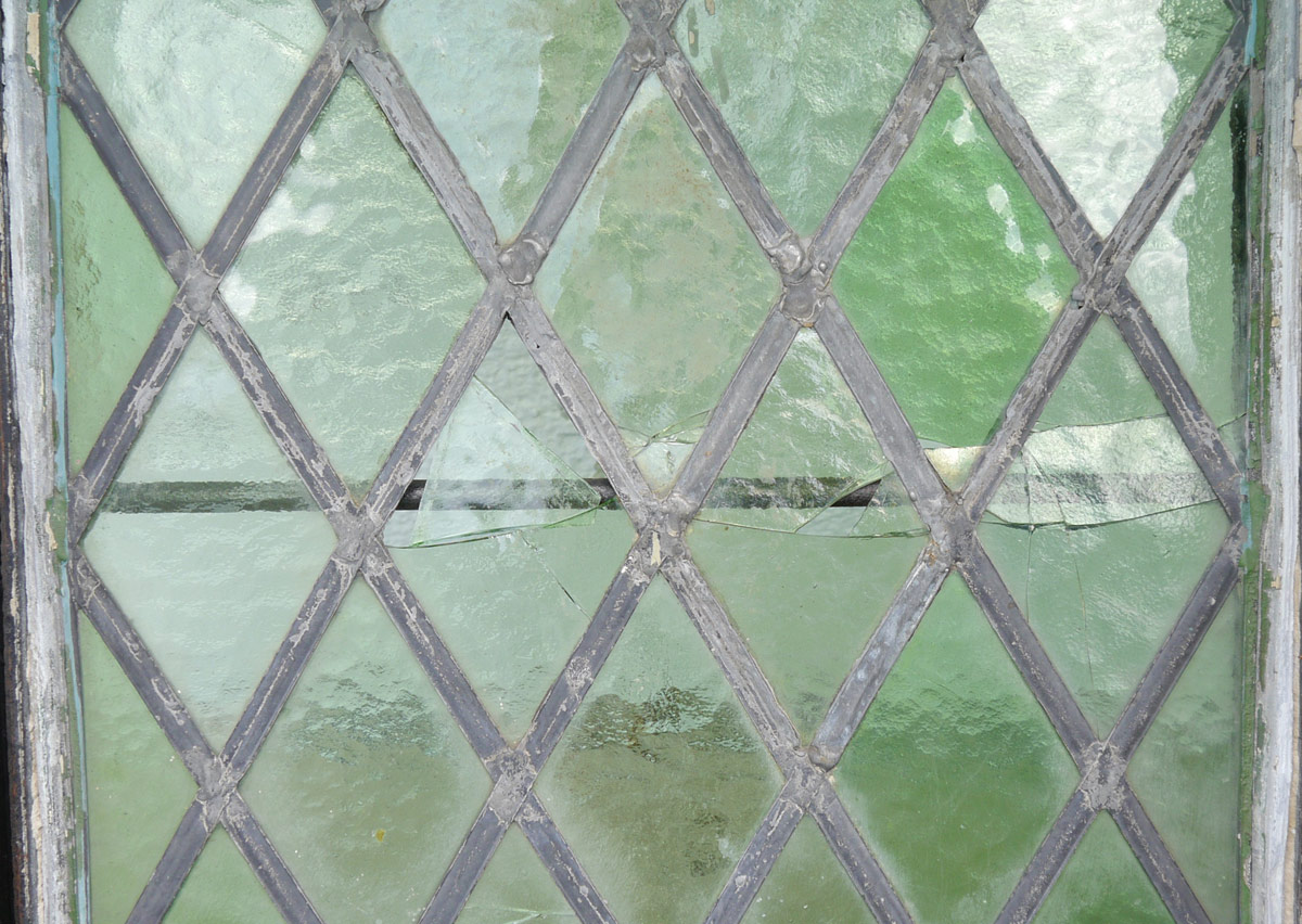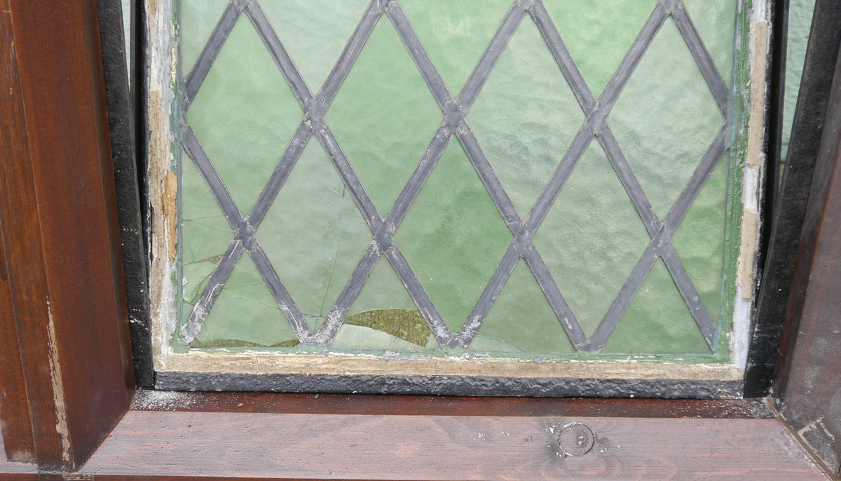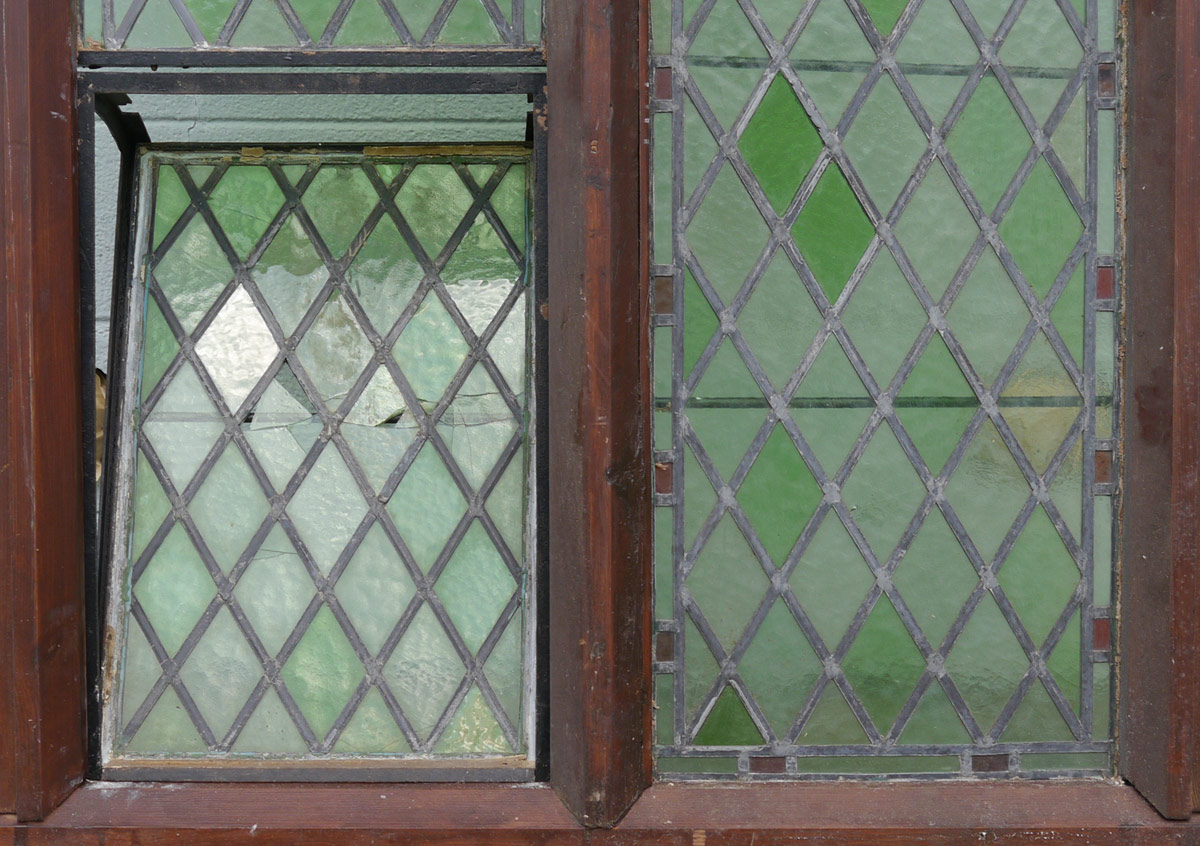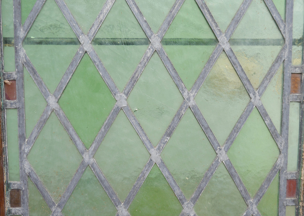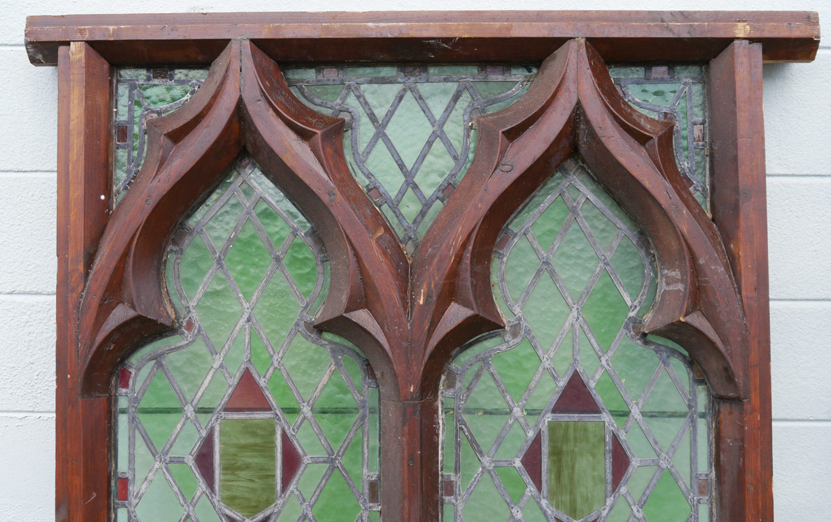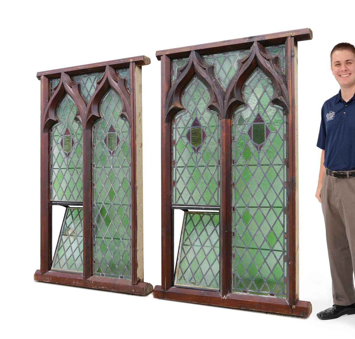2 STAINED GLASS WINDOWS FROM ENGLISH MONASTERY: Each with vent, frame measures approx. 76 3/4'' h. x 47 1/4'' overall.