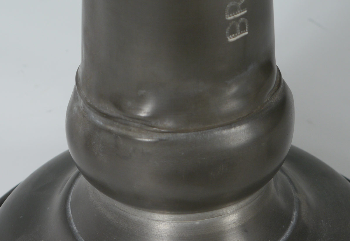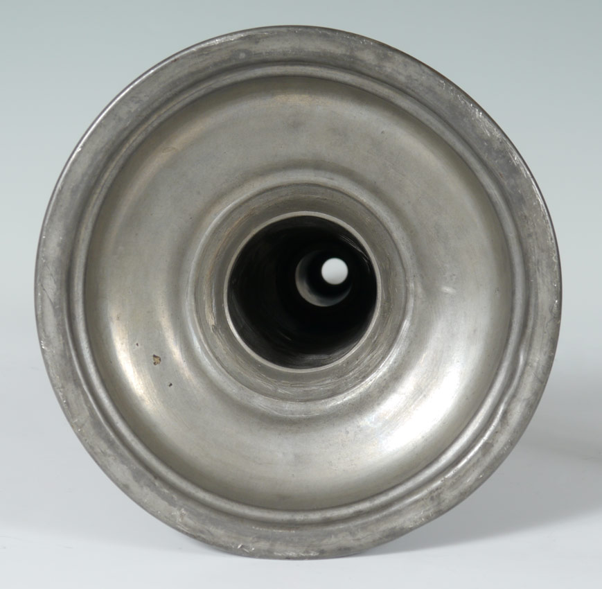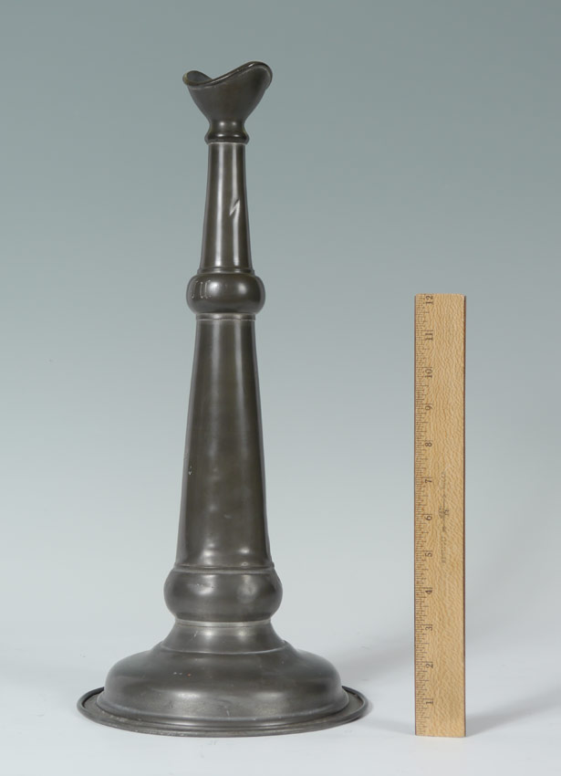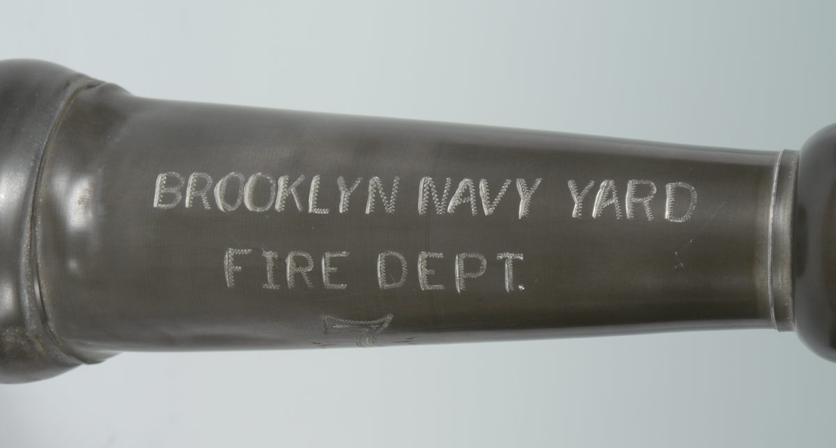 19TH CENTURY BROOKLYN NAVY YARD FIRE HORN: Mid 19th century pewter fire or parade horn. Engraved on body ''Brooklyn Navy Yard Fire Dept. 7''. 19'' h. x 8 1/2''.