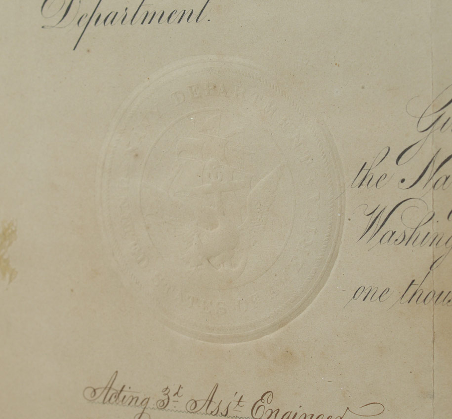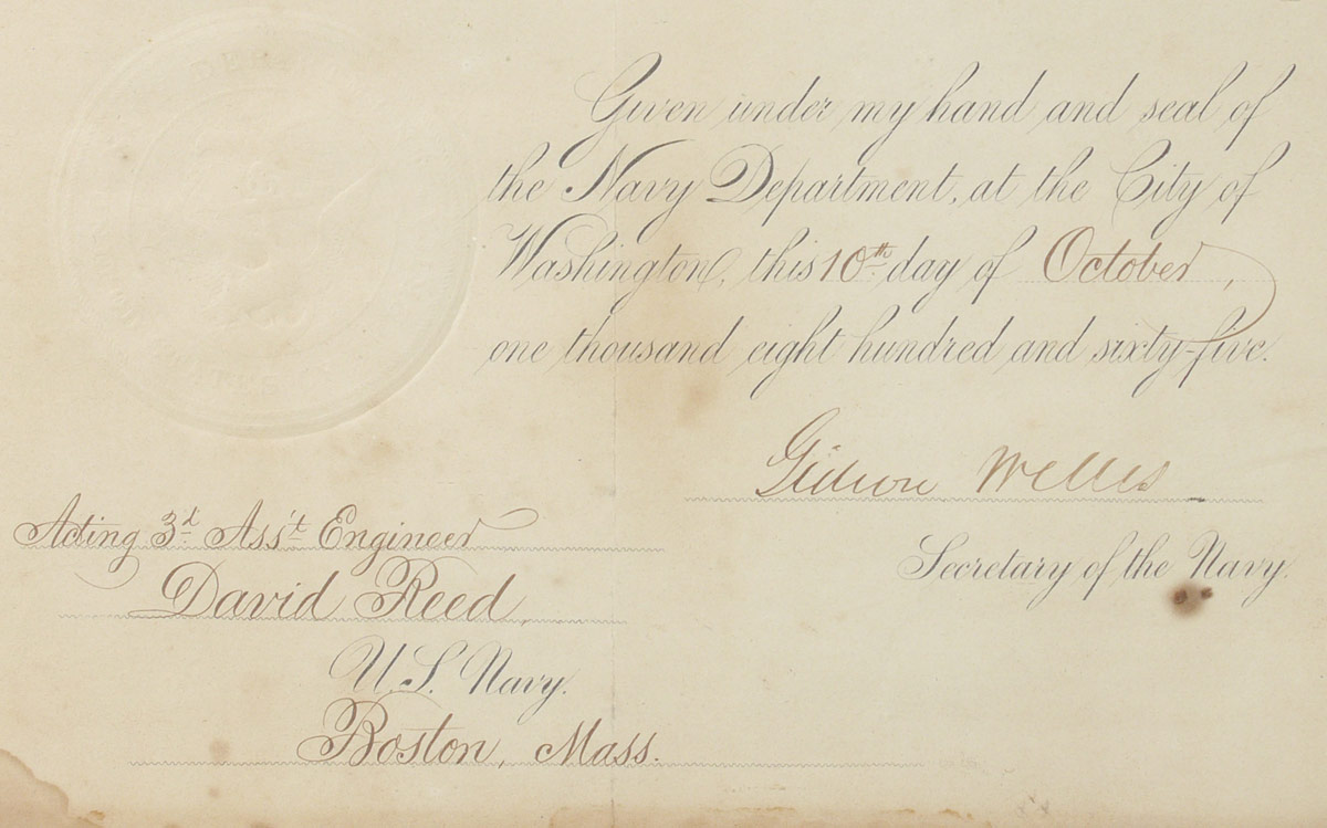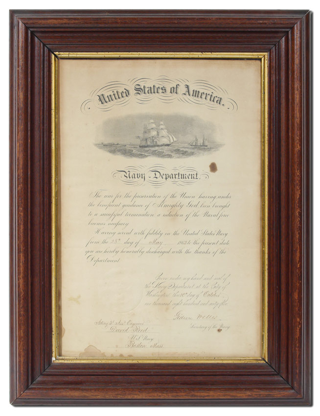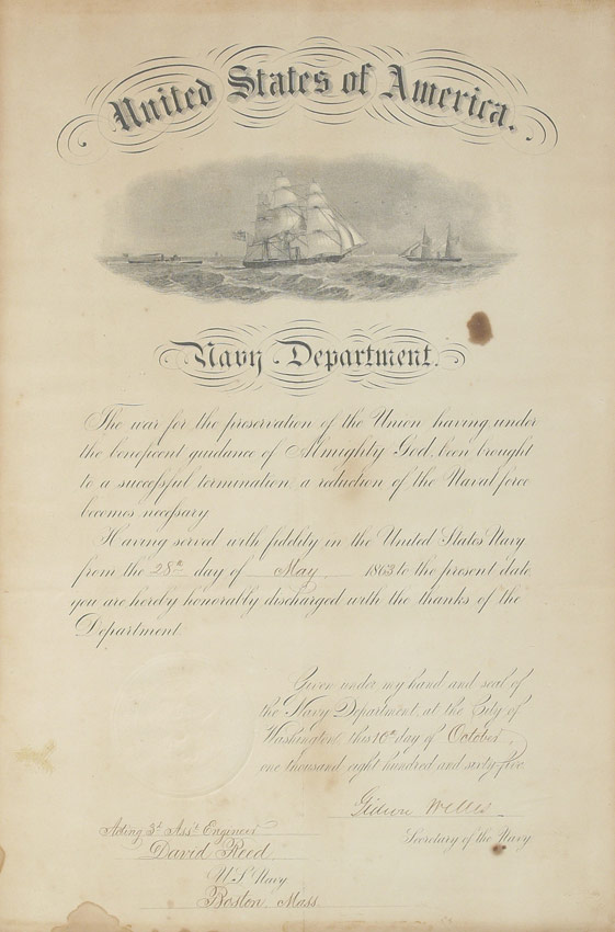 CIVIL WAR NAVAL DISCHARGE DOCUMENT: Dated October 10th, 1865 and signed by Gideon Wells, Secretary of the Navy for Acting 3rd Assistant Engineers David Reed. Sight size 15 3/4'' x 10 3/4'', framed under glass 21'' x 16''.