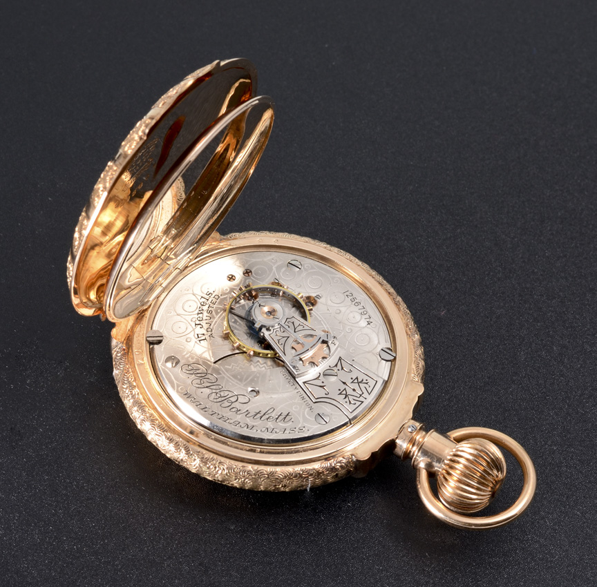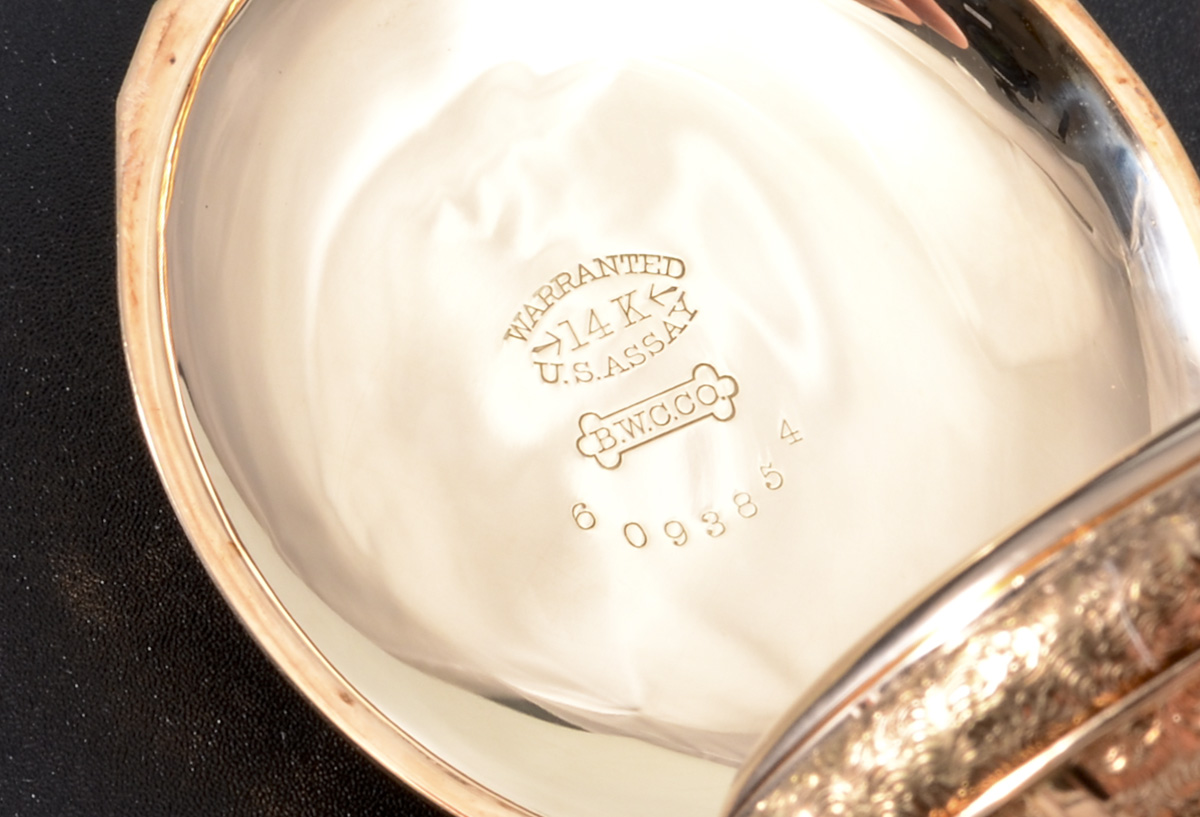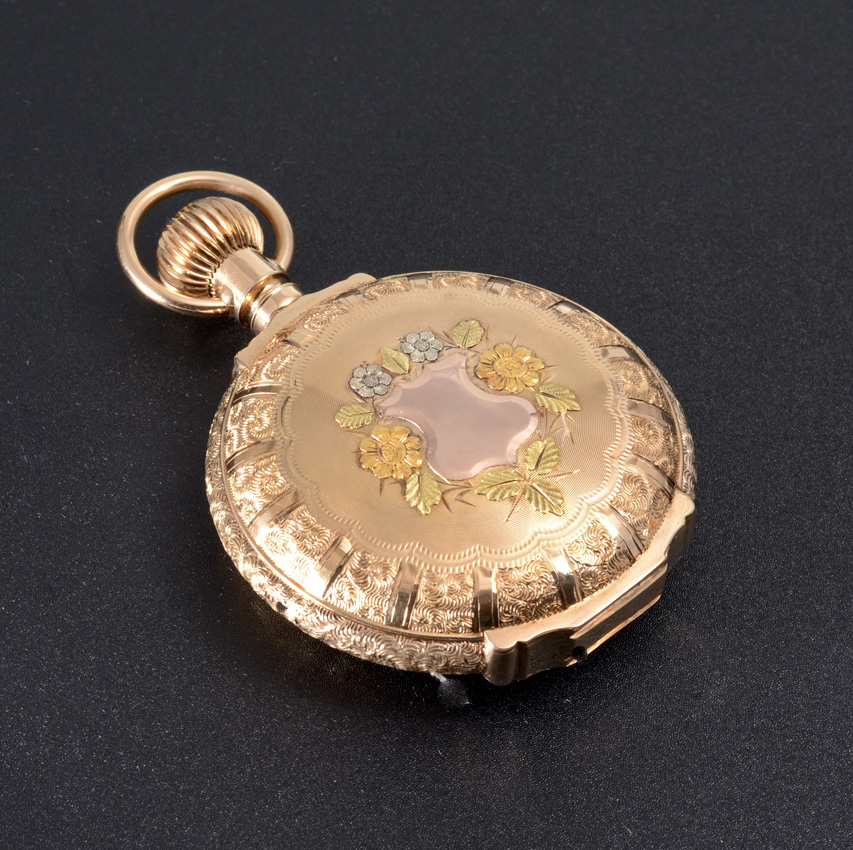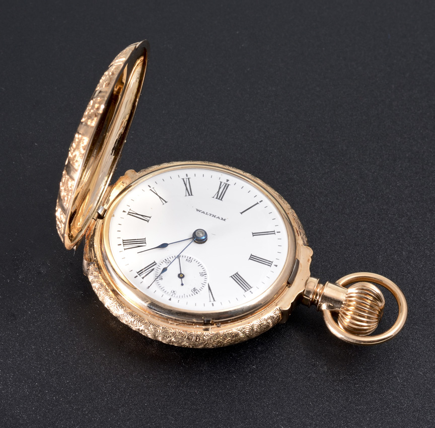 14K MULTI COLOR GOLD WALTHAM HUNTER CASE POCKET WATCH: Circa 1903, size 18 hunter case with box hinge and stag motif, 17 jewel movement, pendant wind lever set, serial #12567974.