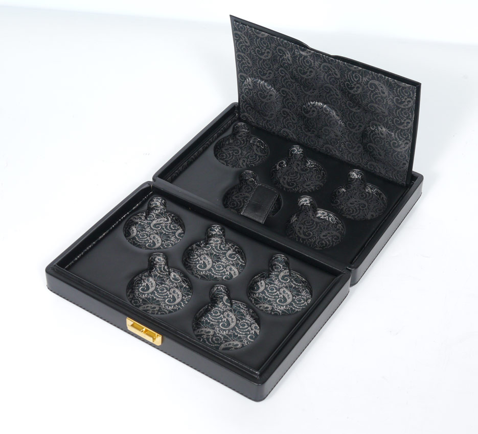 SCATOLA DEL TEMPO POCKET WATCH CASE: Black leather with gold plated clasp. Fitted to hold 10. Measures 3'' x 10'' x 6 1/2''. #530.