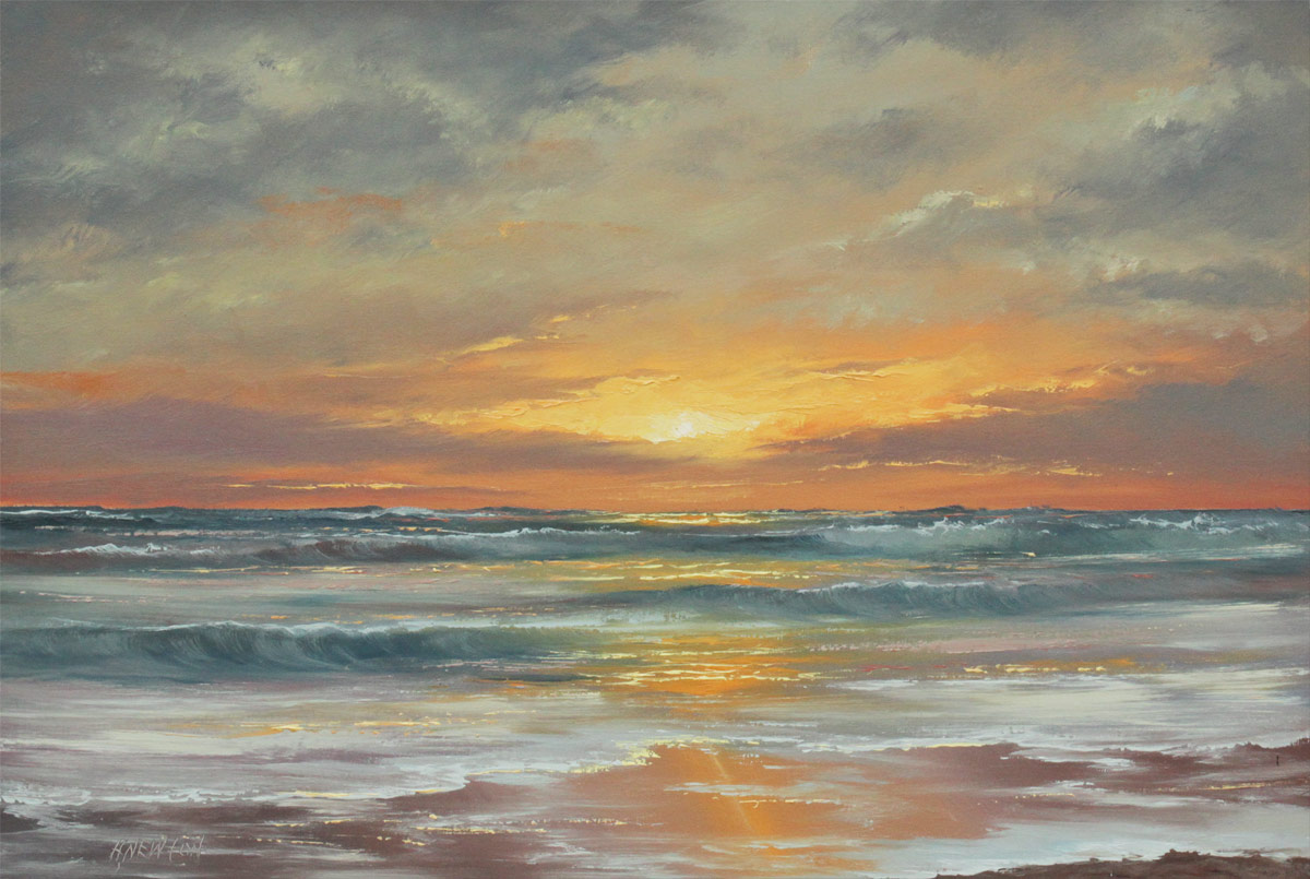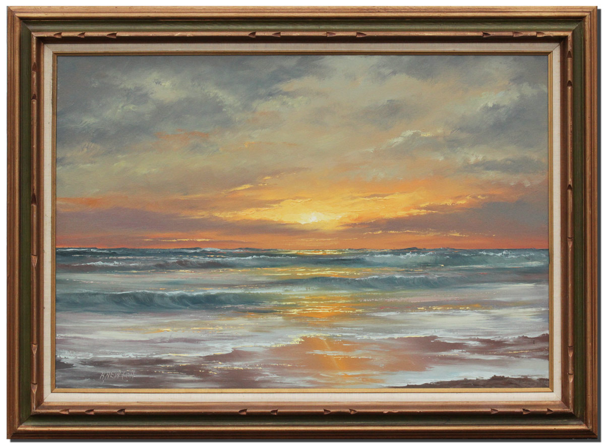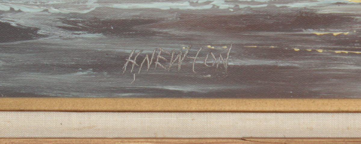 NEWTON, Harold, (American, 1934-1994): Florida Highwaymen Beach Sunset scene, very unusual Oil/Canvas as Newton worked almost exclusively on Masonite and Upson, framed in period frame. Signed lower left, 24'' x 36'', framed 31'' x 43''.