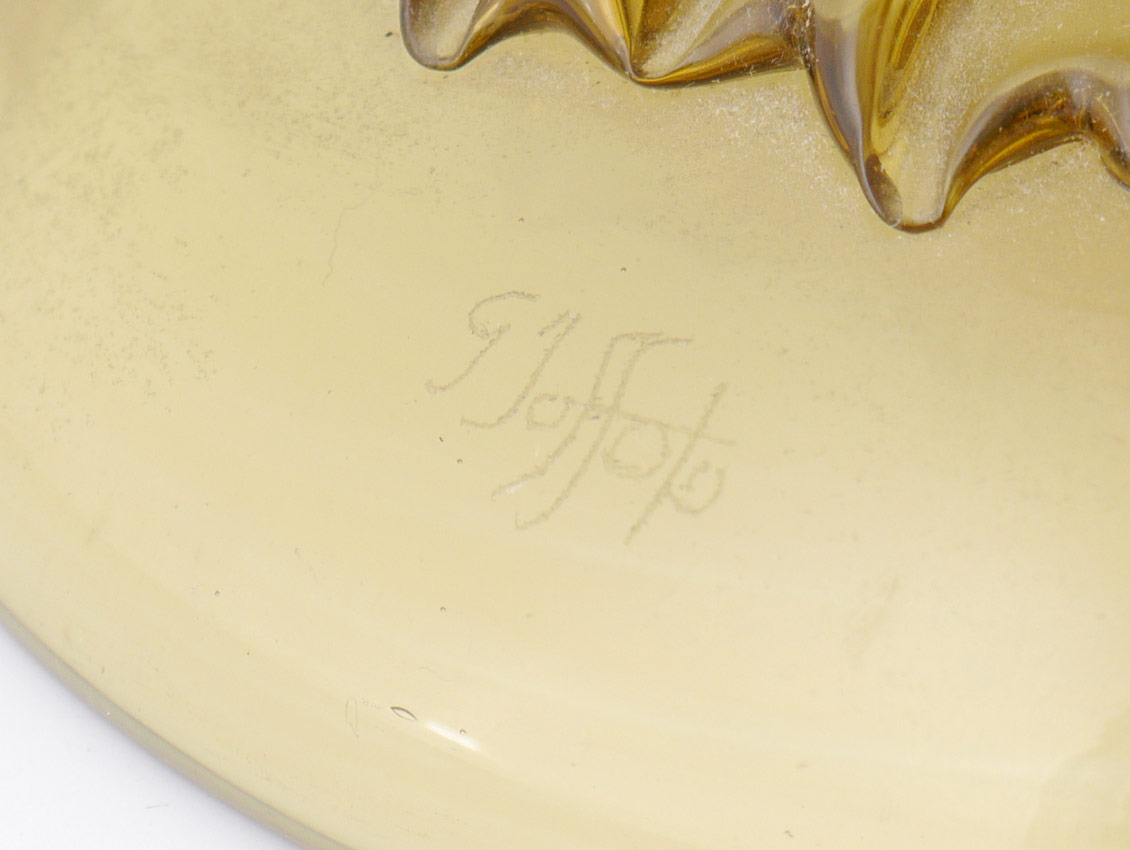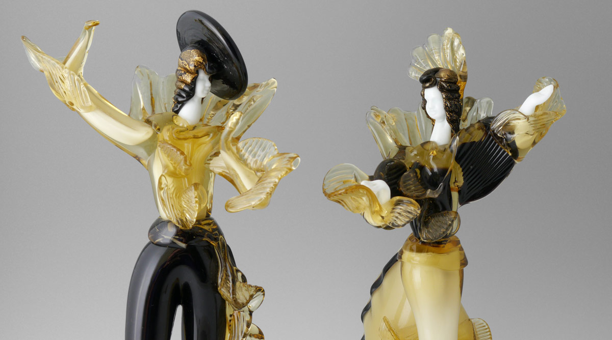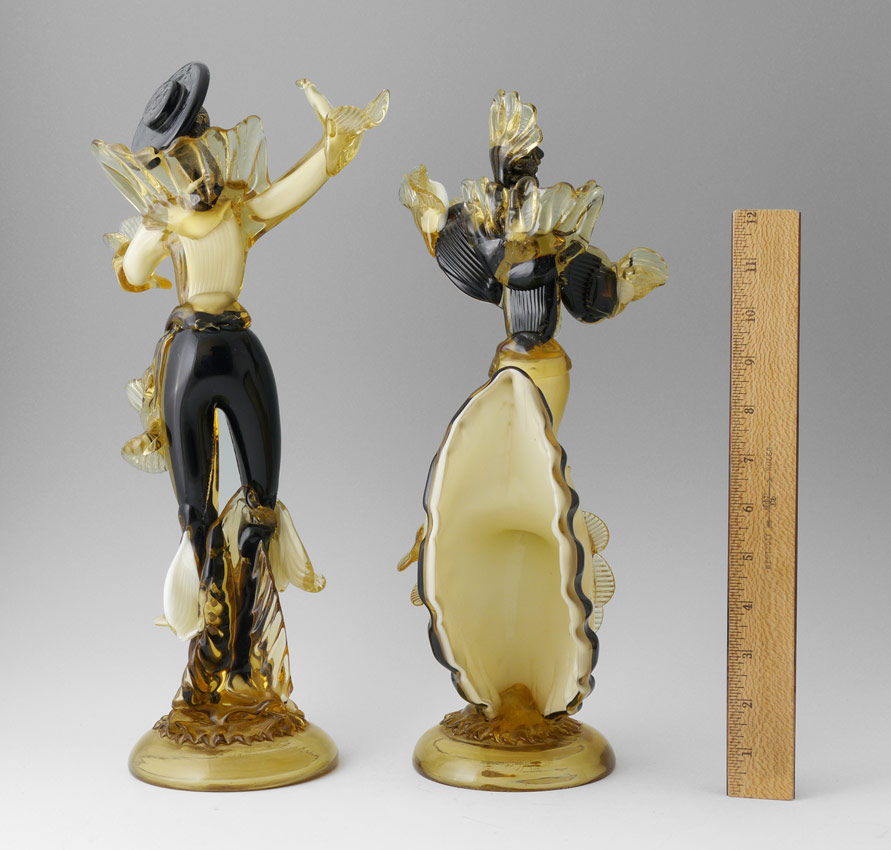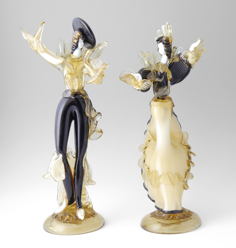 TOFFOLO MURANO GLASS FLAMENCO DANCER FIGURINES: In shades of amber and black, white faces on both, white hands on woman. Etched signature G. Toffolo. Male dancer 15 1/2'' h. x 7 3/4''.