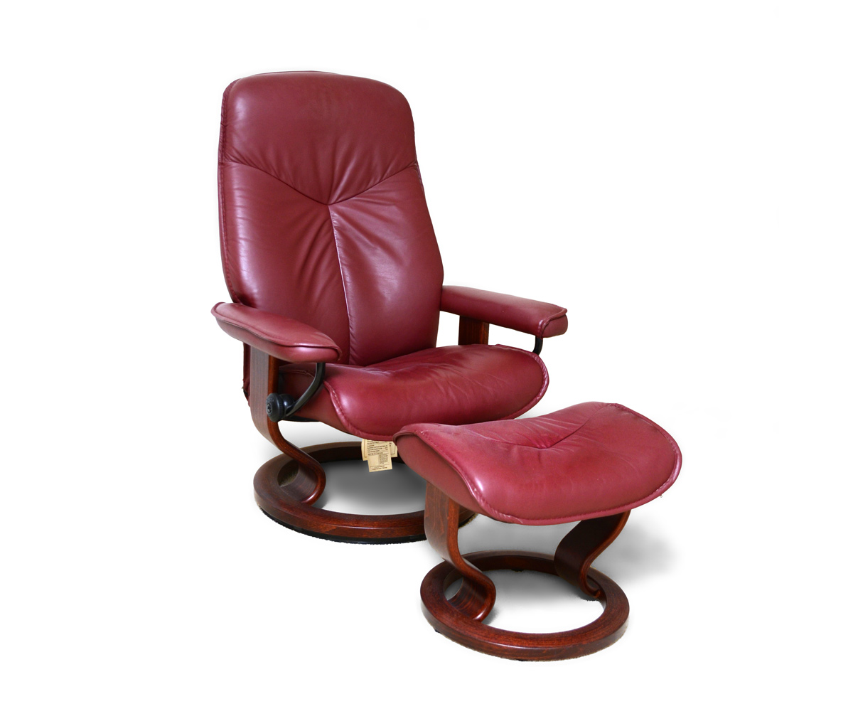 EKORNES STRESSLESS CHAIR & OTTOMAN: Burgundy leather upholstery. Chair 40 1/4'' h. x 29 3/4'' x 28'', ottoman 16 1/4'' h. x 19 1/4'' x 15 1/4''.