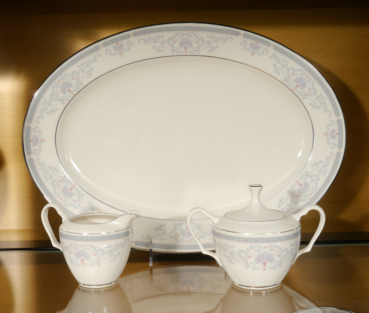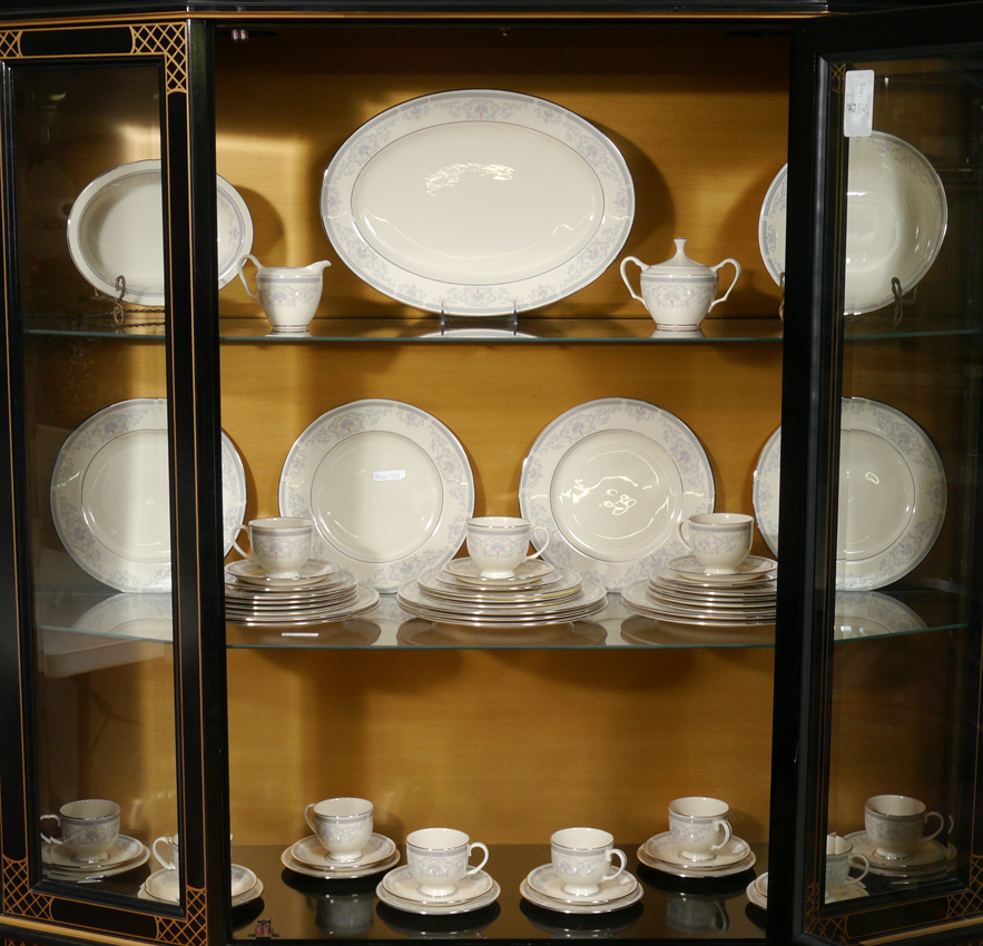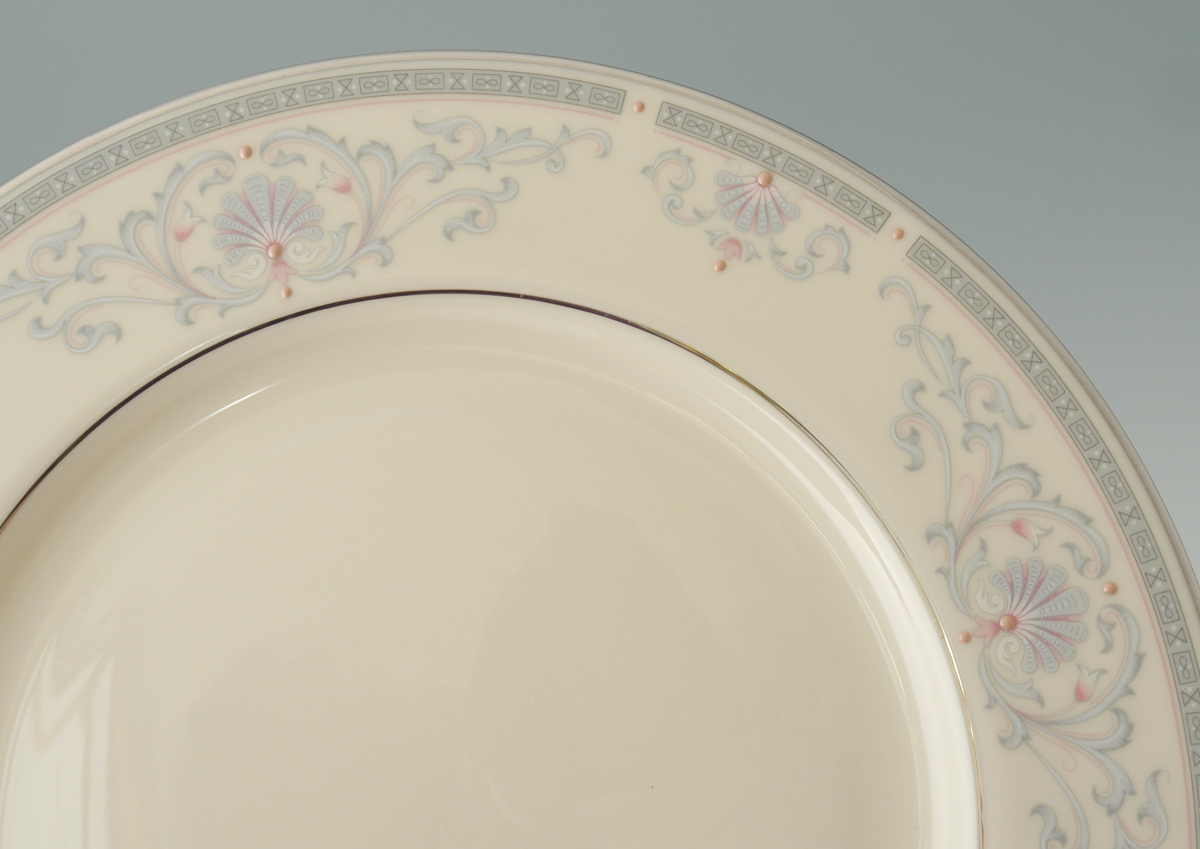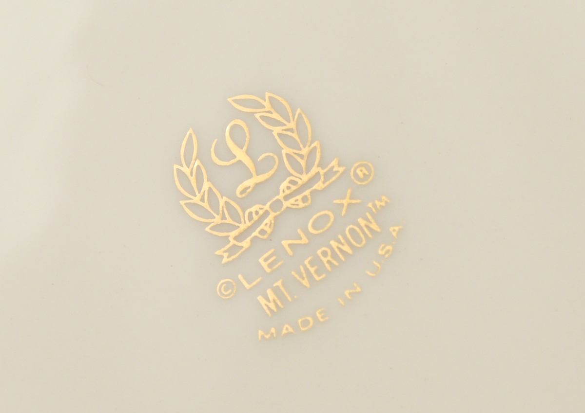 60 PIECE LENOX MOUNT VERNON CHINA: Approx. 60 pieces in the Mt. Vernon pattern by Lenox to include 11 plates (10 1/2''), 11 salad plates (8 1/4''), 11 bread plates, 11 teacups and 11 saucers, oval platter (16'' x 11 3/4''), open vegetable, open creamer, covered sugar, serving bowl (3'' x 9 1/2''),