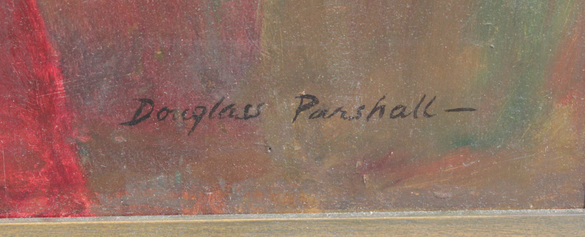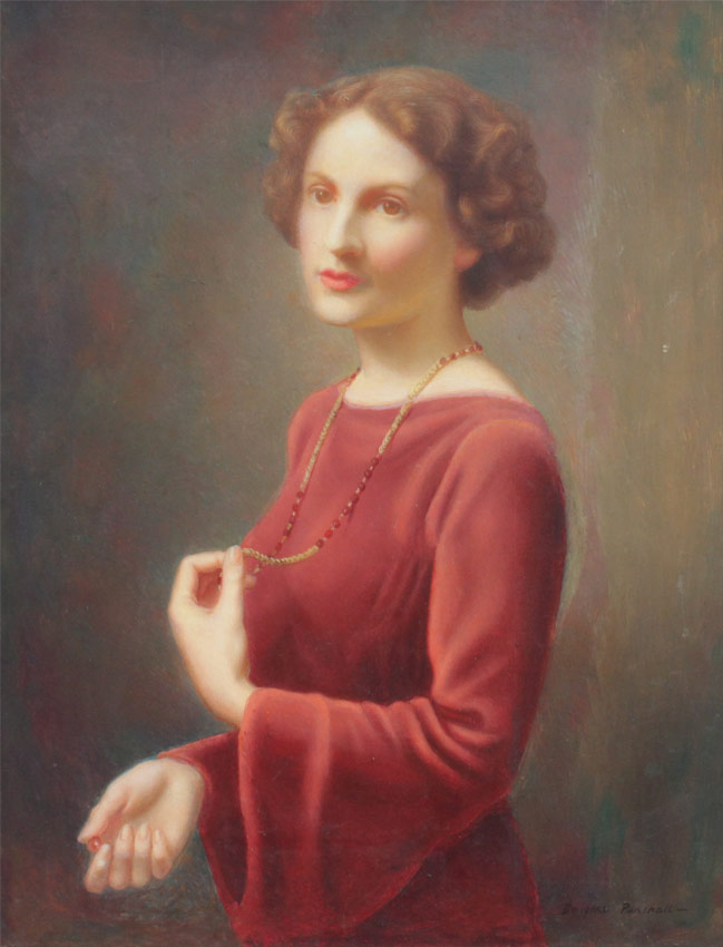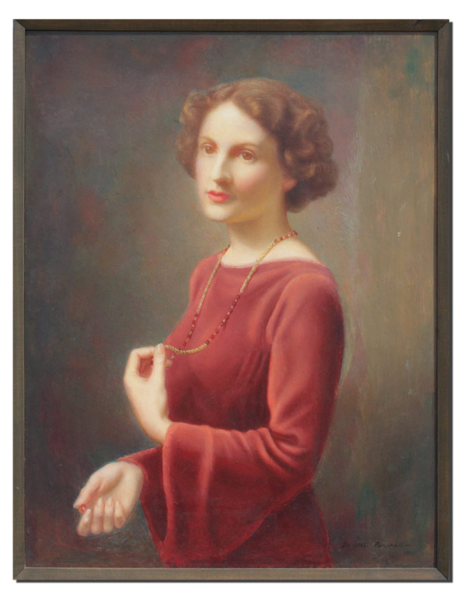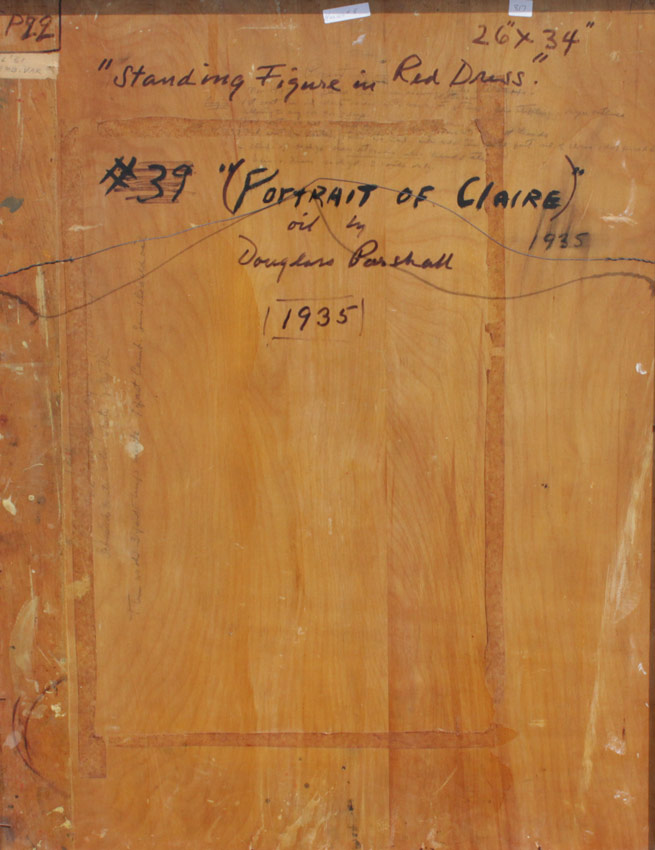 PARSHALL, Douglass Ewell, (American, 1899-1990): ''Standing Figure in Red Dress, Portrait of Claire, #39'', Oil/Board, 34'' x 26'', signed lower right, signed titled and dated 1935 verso, custom frame 35 1/2'' x 27 1/2''.