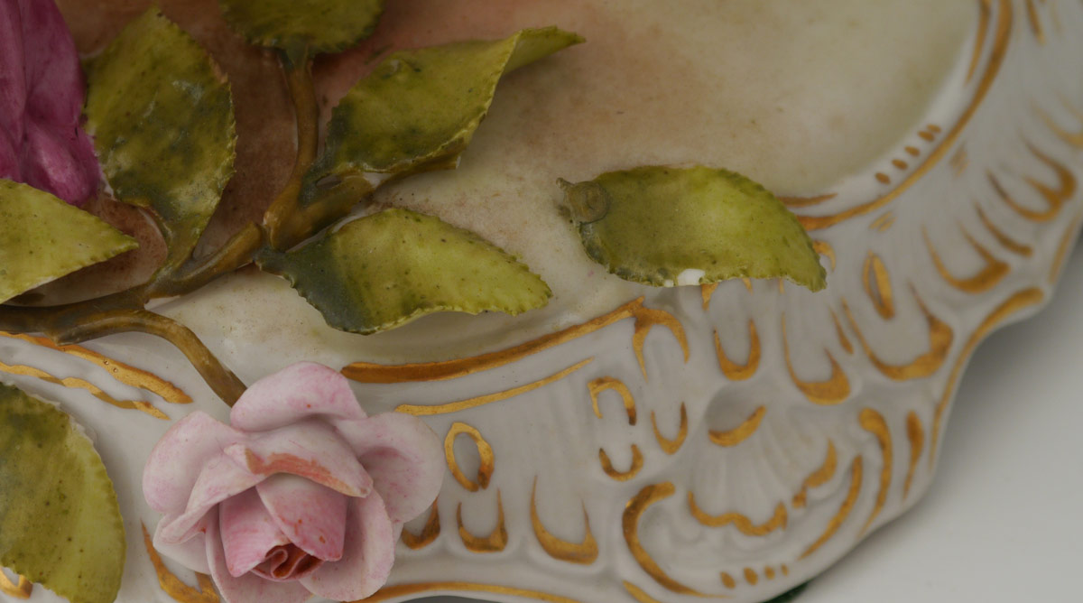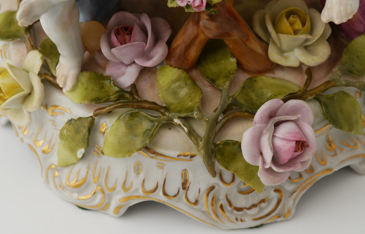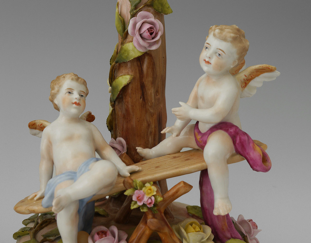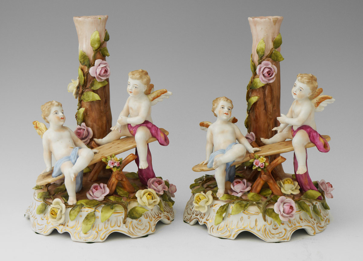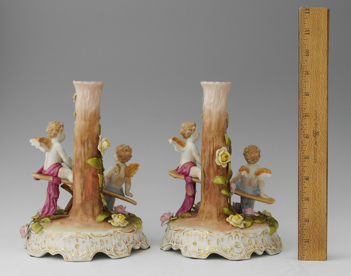 PAIR OF SCHIERHOLZ PORCELAIN FIGURAL CANDLEHOLDERS: Depicting children at play on a teeter totter. Applied flower. Measures 8 3/4'' tall x 6''.