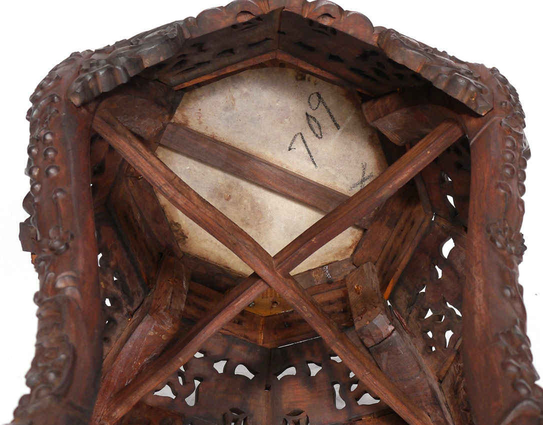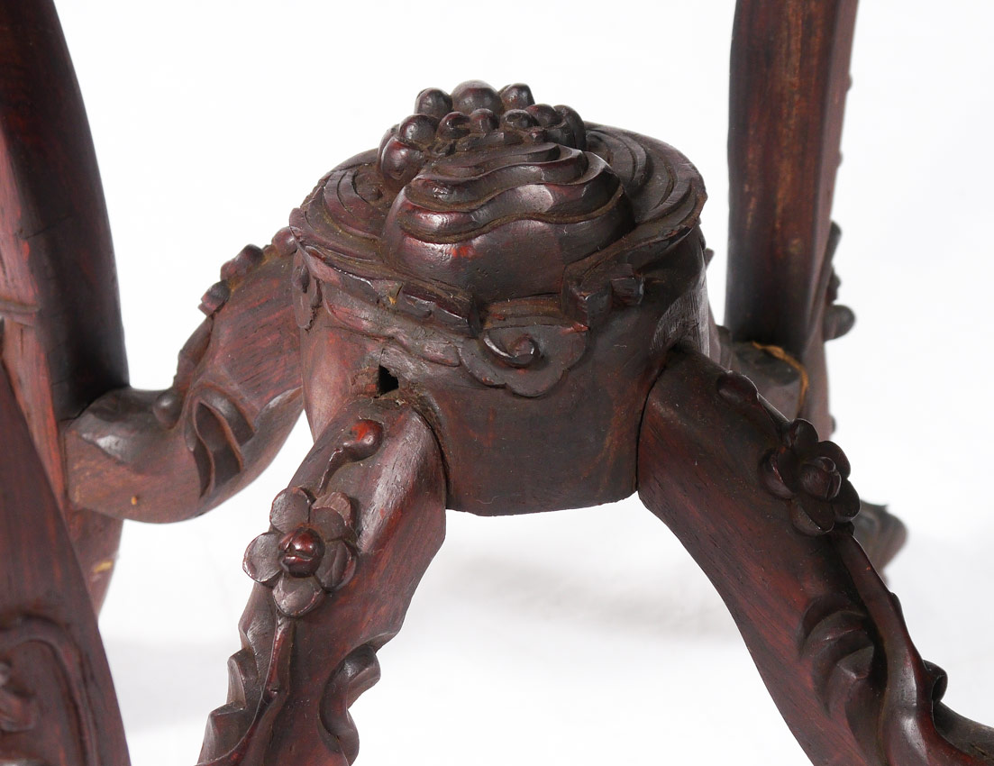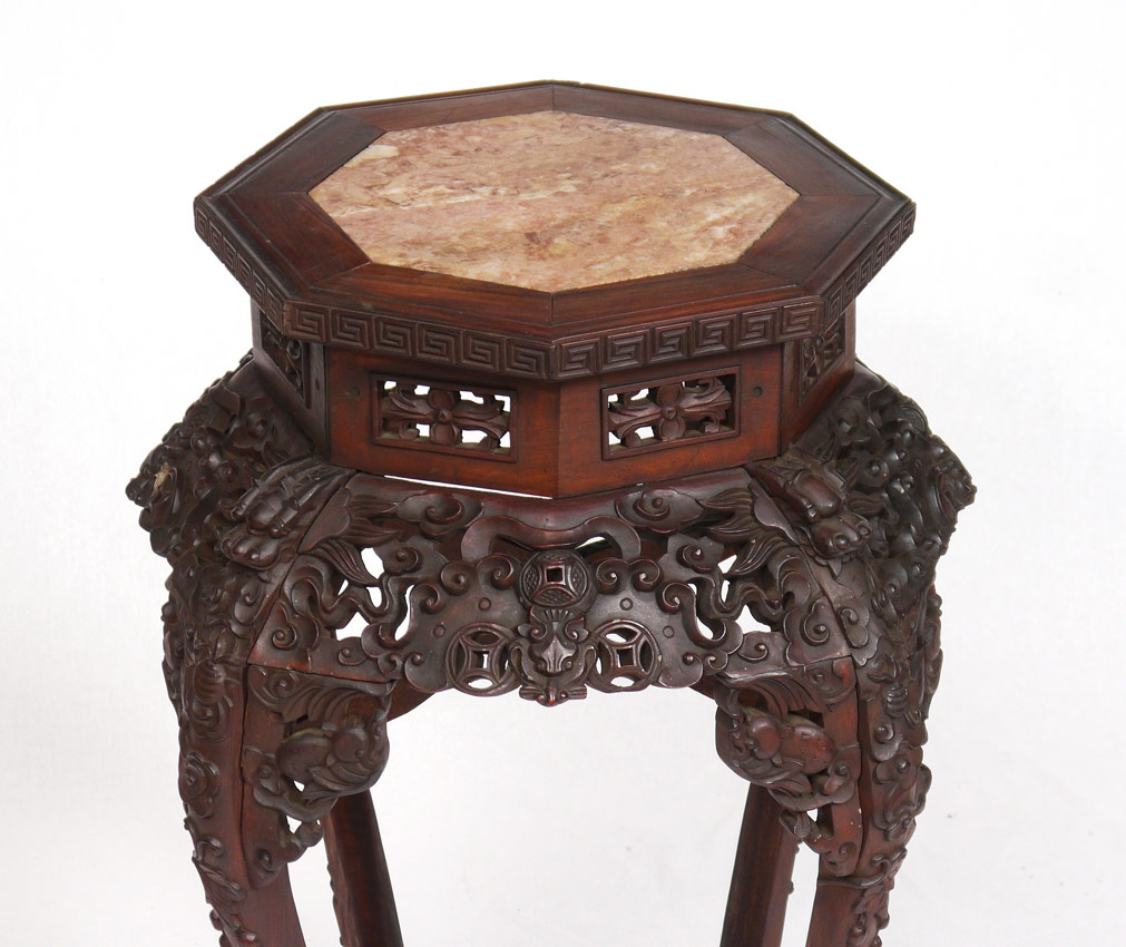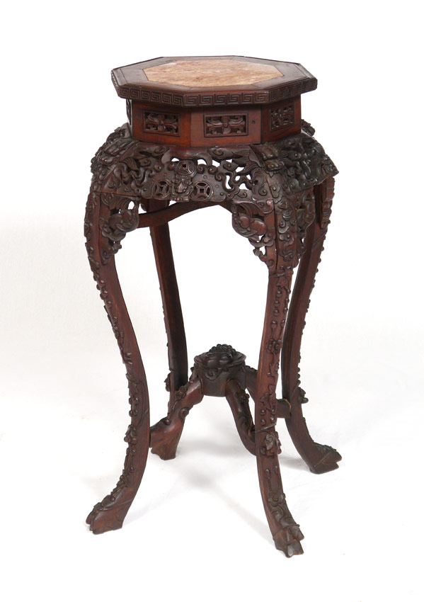 CARVED ROSEWOOD ORIENTAL MARBLE TOP PLANT STAND: Inset marble octagonal top over shaped and profusely pierced carved sides, carved legs and stretcher. Overall measures 34 1/2'' x 24''.