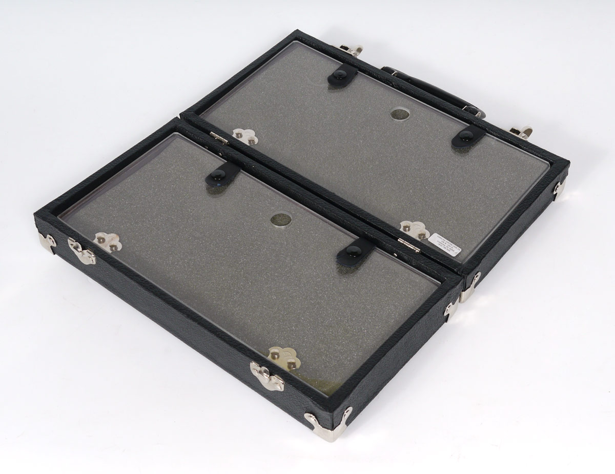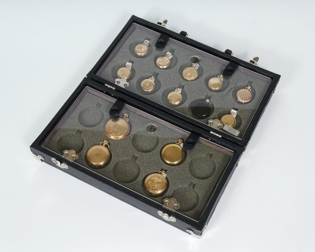 POCKET WATCH CARRYING CASE BY CAROLINA CASE COMPANY: Fitted to hold 20 pocket watches. Metal mounted hard case with handle. 3 1/2'' x 8'' x15''.