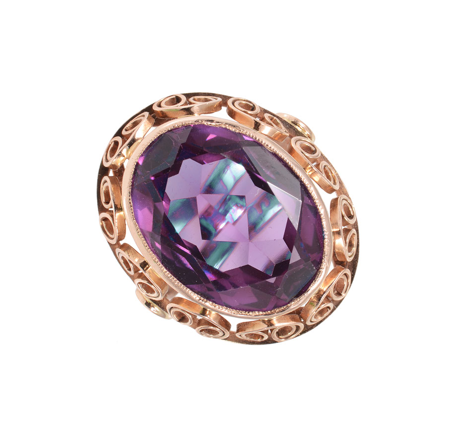ART DECO ROSE GOLD 25 CT COLOR CHANGING SAPPHIRE RING: 14K rose gold ring centers one large 25 Ct. oval mixed cut synthetic sapphire. Color change, alexandrite like stone. Bezel set. Cut-out gallery. Mounting Weight: 6.4 grams approx. Size: 7.