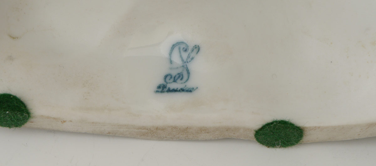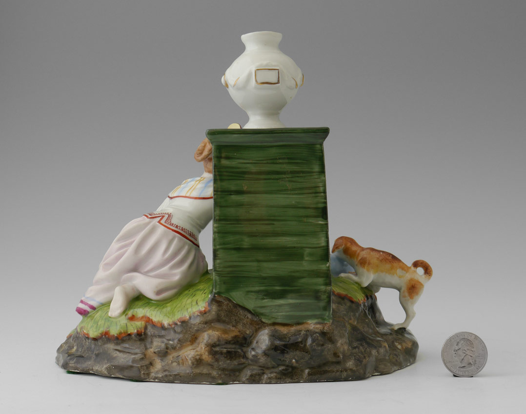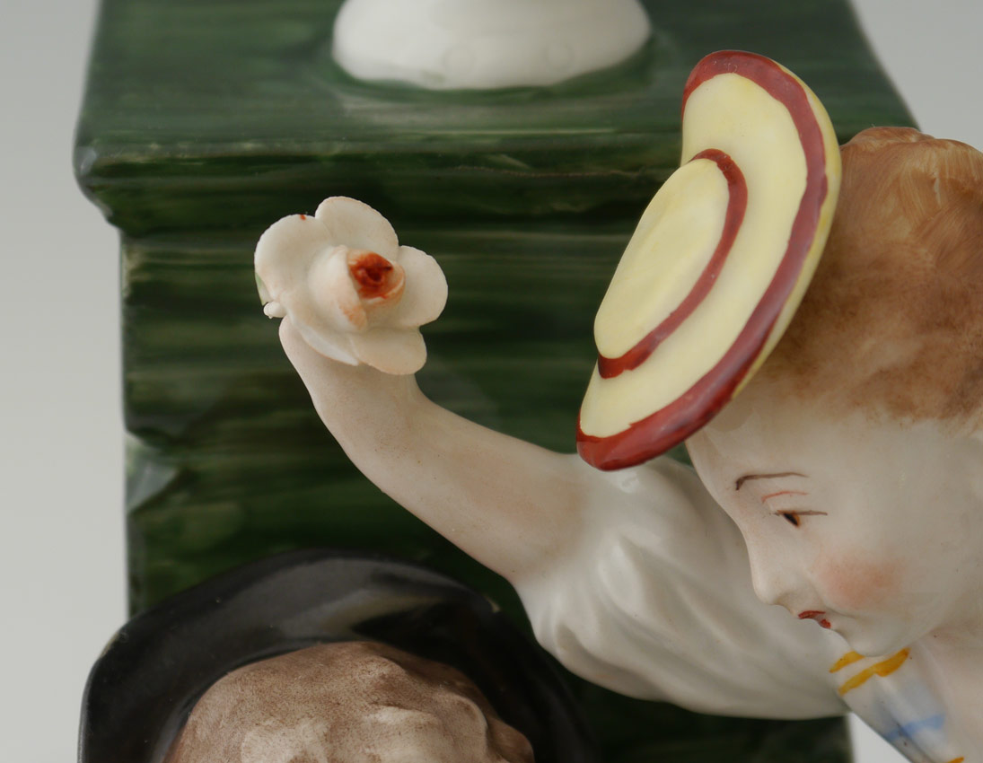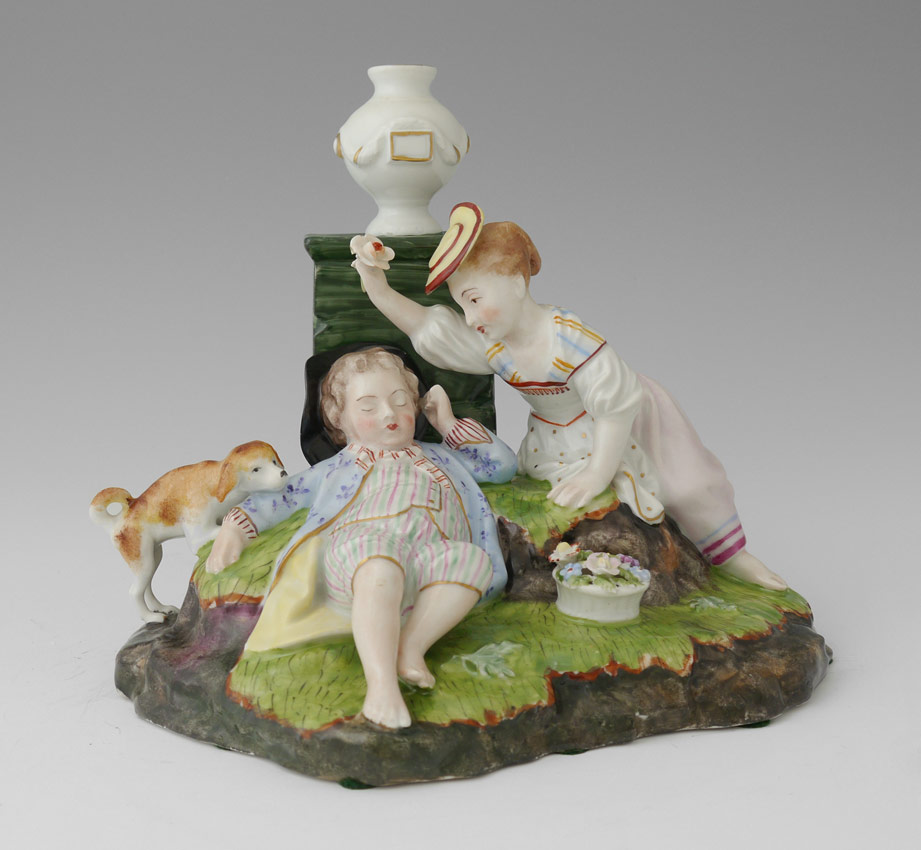 CARL THIEME DRESDEN PORCELAIN FIGURAL GROUP: Depicting a boy sleeping, with admirer looking on. Measures 7 1/4'' x 8 1/2'' x 7 1/4''.