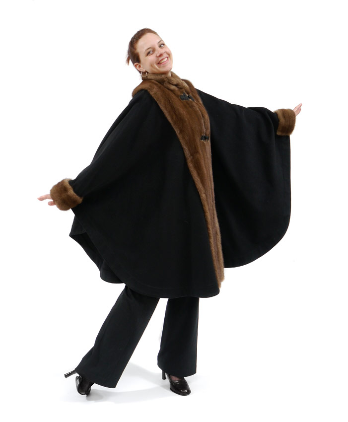 FULL LENGTH CASHMERE WOOL CAPE WITH MINK TRIM: Mink collar and cuffs on black wool, frog closures, generous proportion. Measures approx. 40'' length collar to hem.