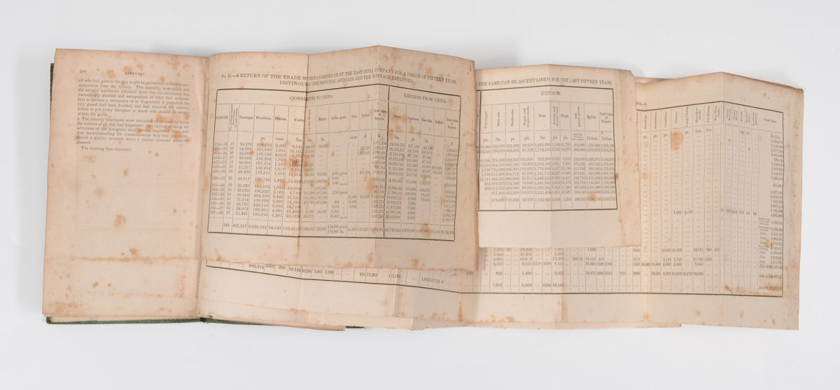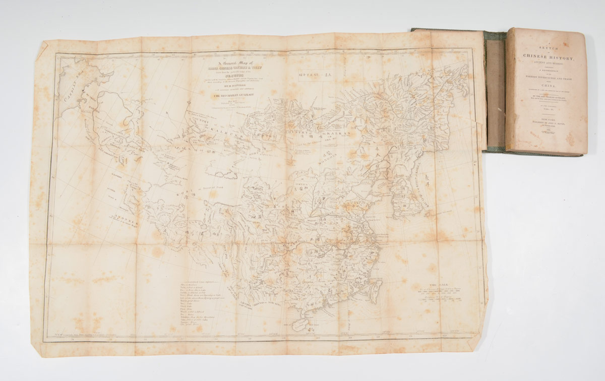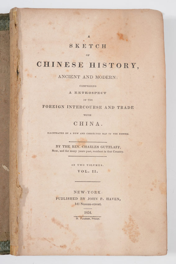 GUTZLAFF, Charles D., (German, 1803-1851): ''A Sketch of Chinese History, Ancient and Modern'', volume II only of the 2 volume set. Published 1834 by John P. Haven, New York. Green pebbled cloth covers with trace of gilt lettering remaining on spine. This is the more desirable of the 2 volumes with a large fold out map at front, fold out tables at back. 8'' x 5''.