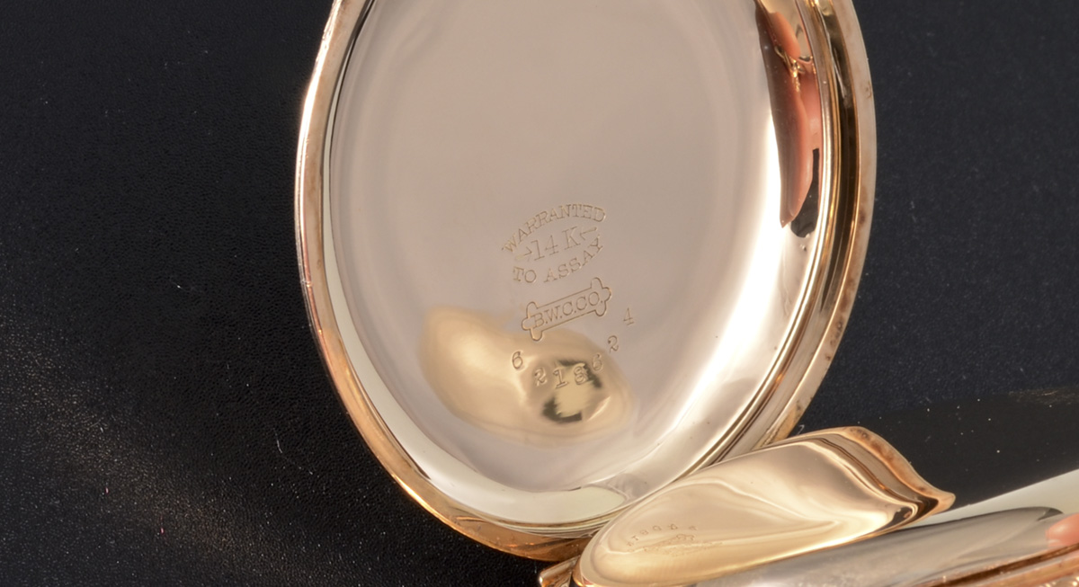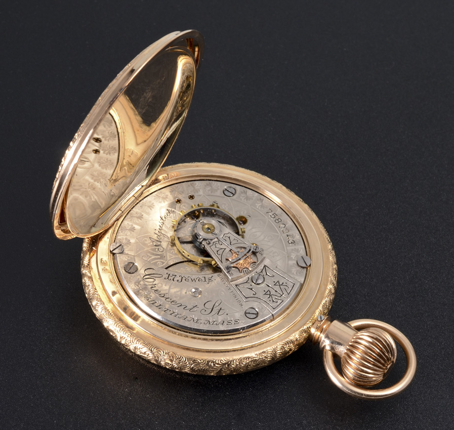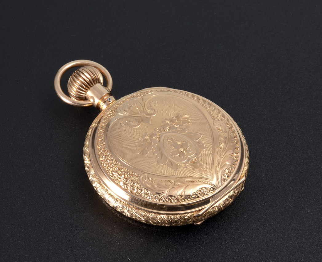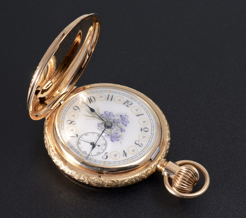 14K YELLOW GOLD WALTHAM HUNTER CASE POCKET WATCH: Circa 1896, size 18 hunter case with heart design and second tone of gold, fancy white and gold dial in purple violet motif, pendant wind lever set, 17 jewel movement, serial #7580243.