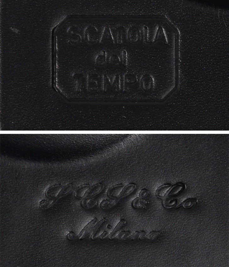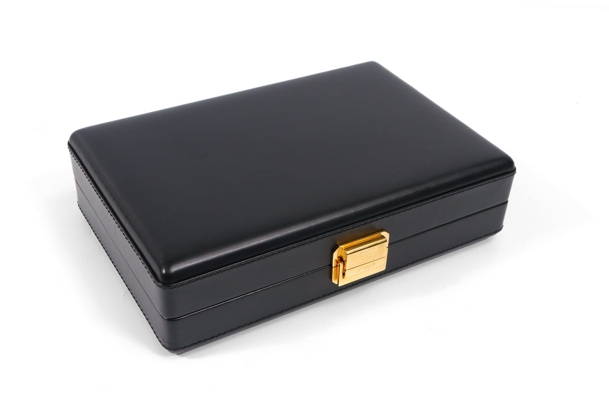 SCATOLA DEL TEMPO POCKET WATCH CASE: Black leather with gold plated clasp. Fitted to hold 10. Measures 3'' x 10'' x 6 1/2''. #662.