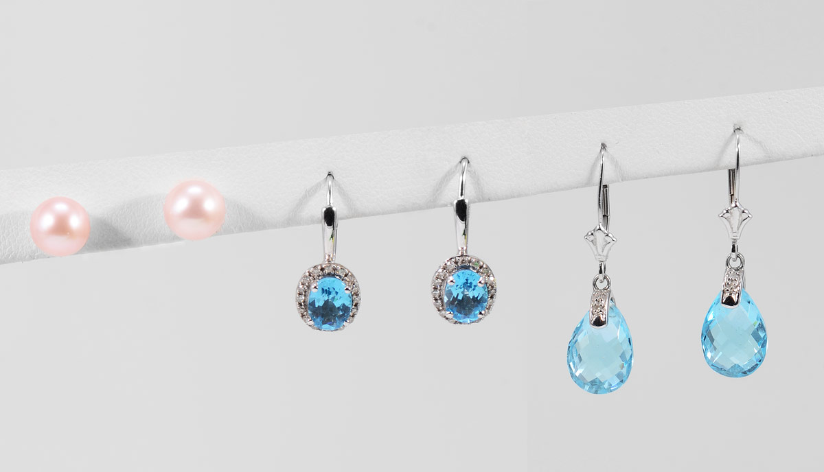 3 PAIR 14K GOLD EARRINGS - TOPAZ AND PEARL: 14K cultured 6.50 mm pink pearl stud earrings, 14K topaz earrings and 14K topaz with .10 Ct. diamond earrings. Weight: 6.0 grams.