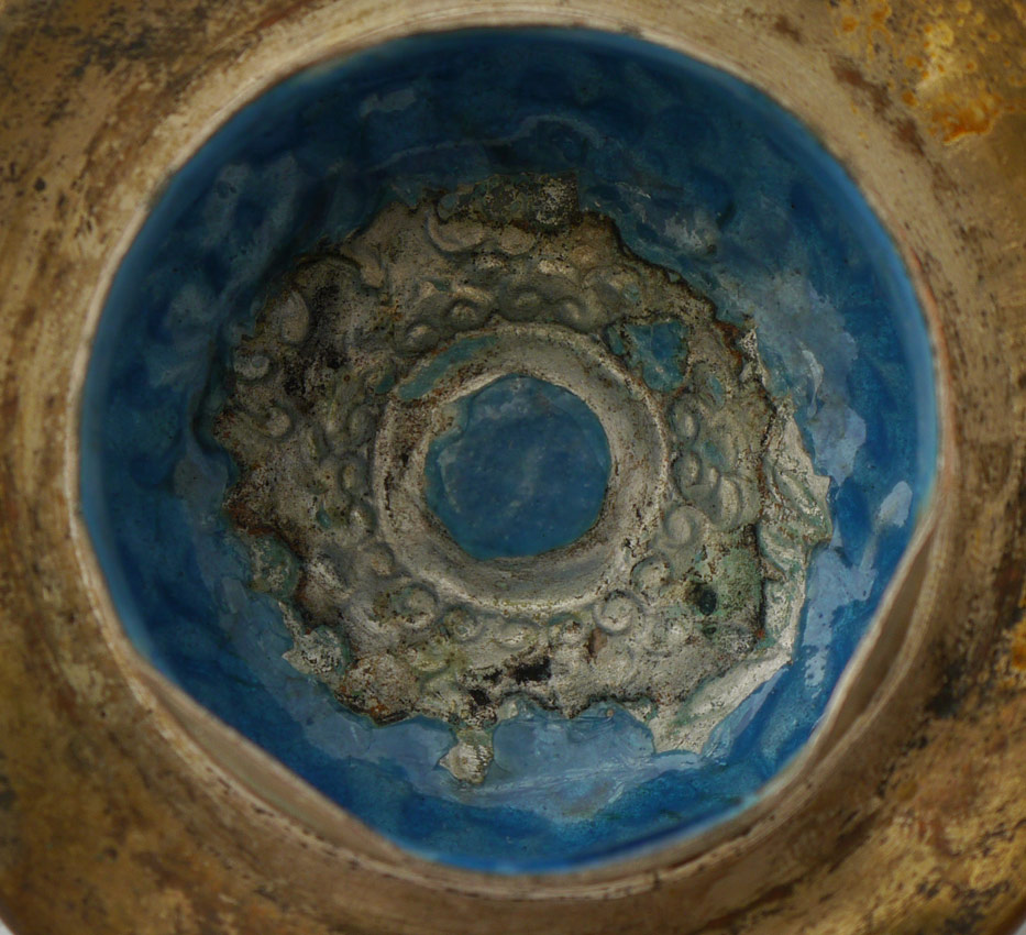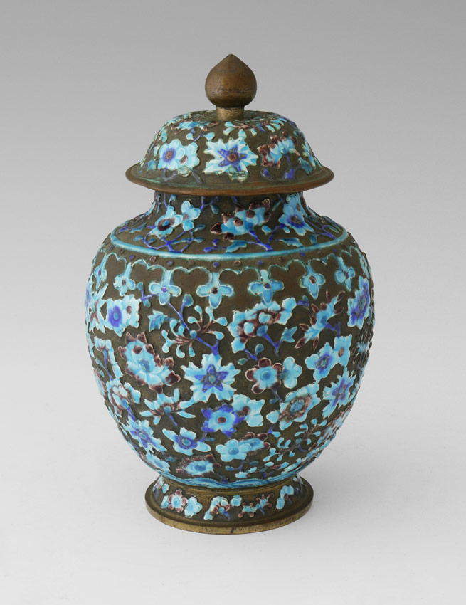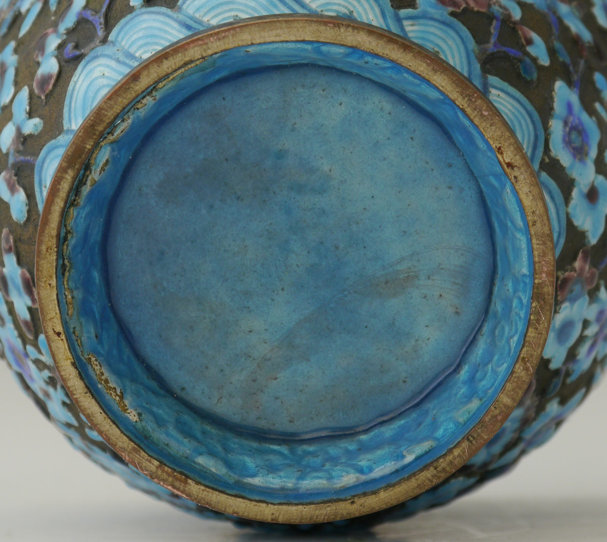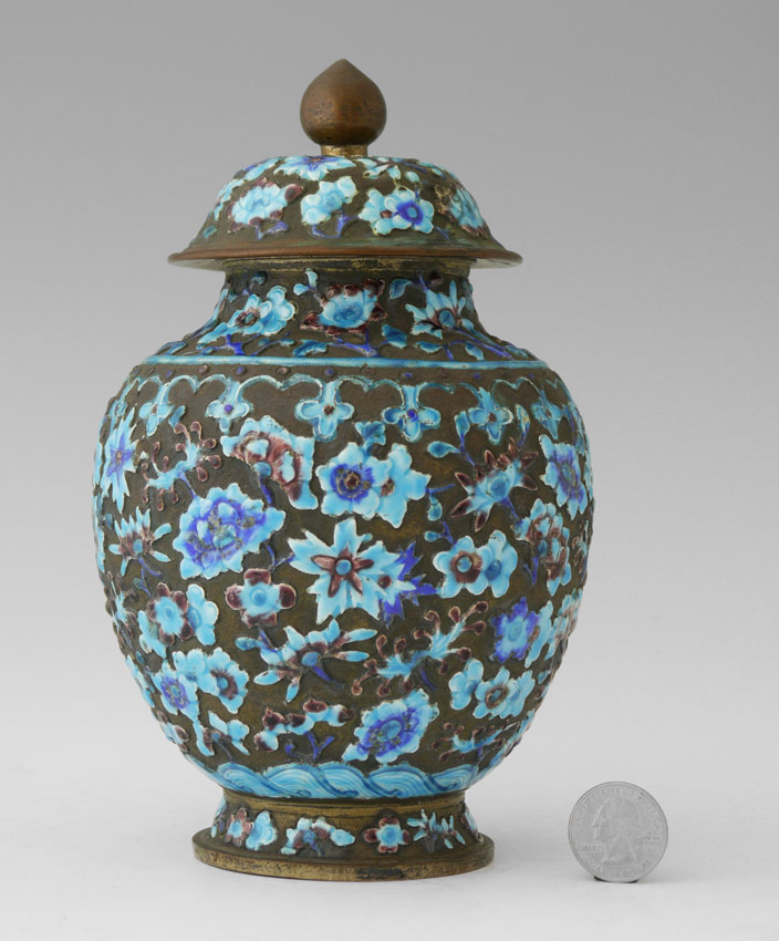 CHINESE ENAMEL LIDDED JAR: Metal body with blue floral motif enamel work. 7 3/4'' h. x 4 3/4''.