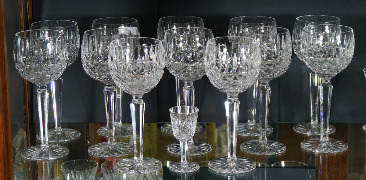 12 WATERFORD CRYSTAL MAEVE WINE HOCKS: 12 wine hocks in the Maeve pattern, 7 3/8'' h. Sold with additional cordial 3 1/2''.