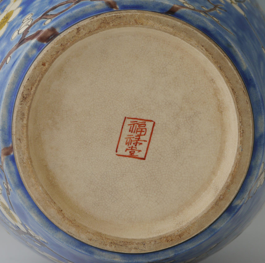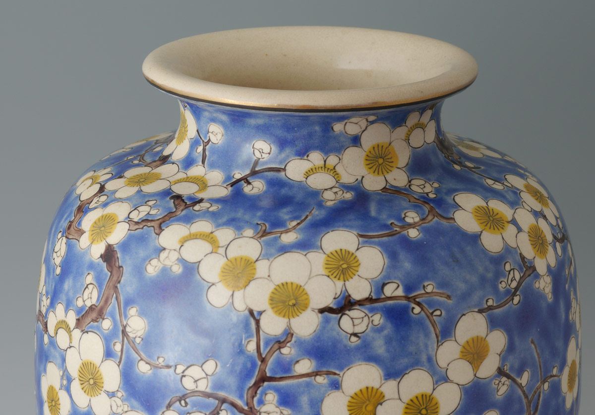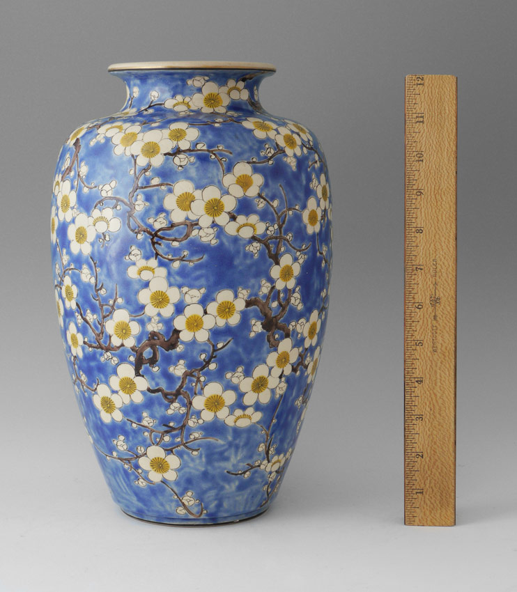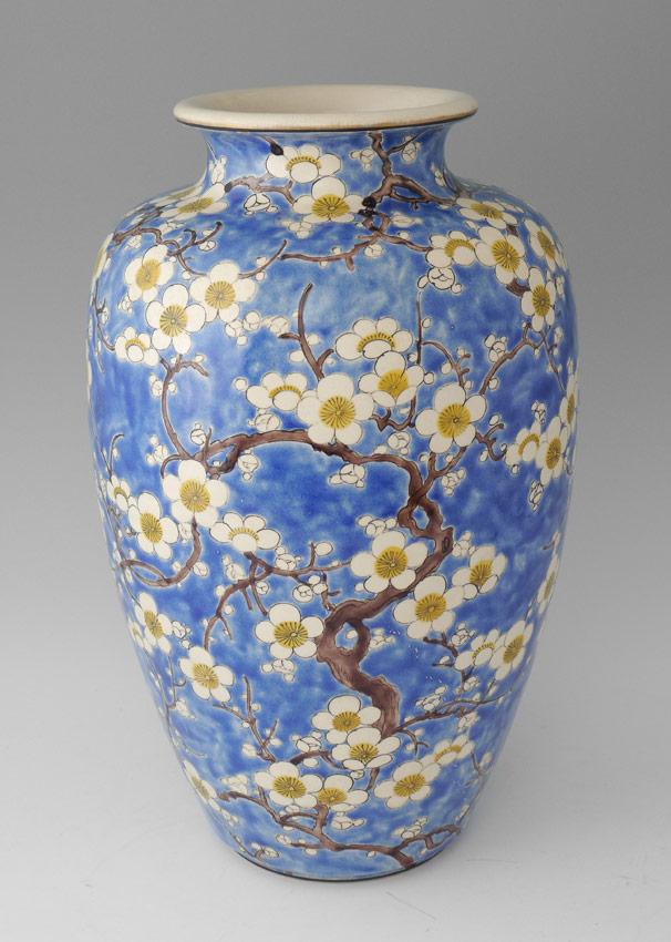 JAPANESE EARTHENWARE CHERRY BLOSSOM VASE: Baluster form vase with blue ground, incised cherry blossom and branches decoration. Unknown mark on base, possibly Arita? Measures 12 3/8'' h. x 7 1/4''.