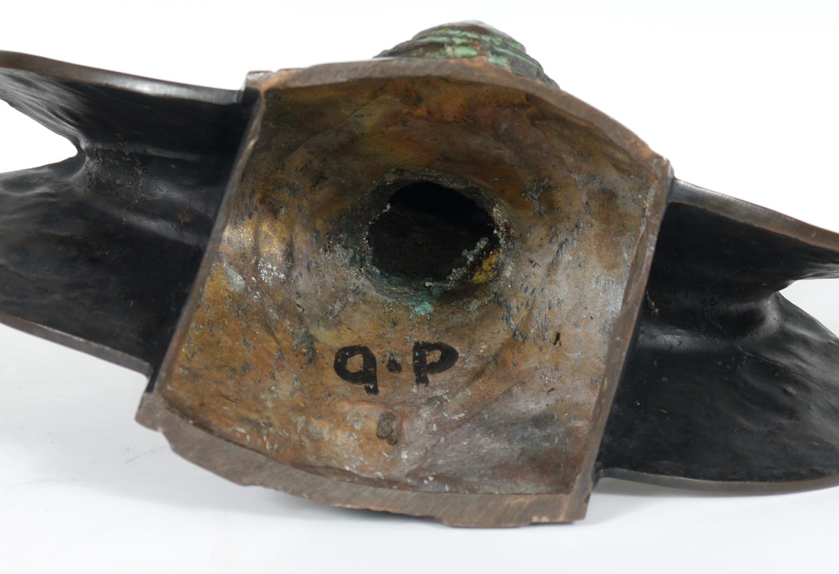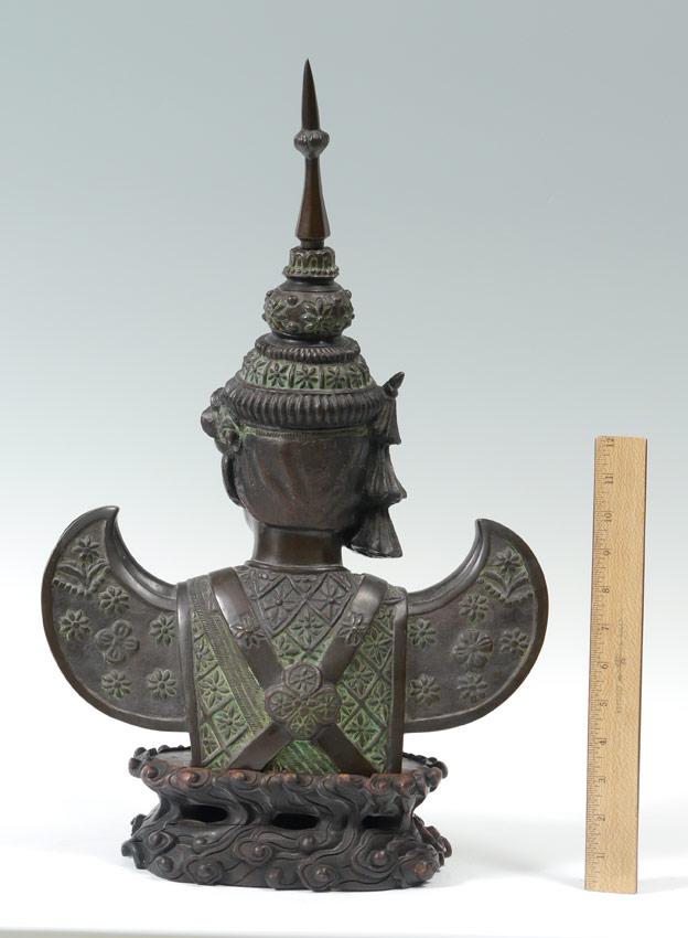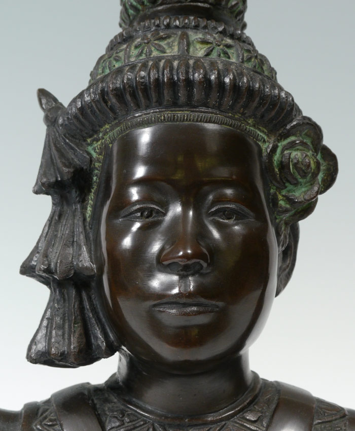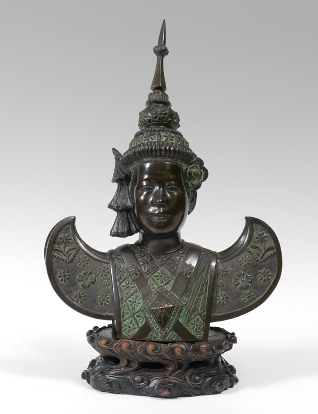 BRONZE BUST OF THAI LAKHON DANCER: Detailed bronze casting of a Siamese or Thai Lakhon Nai dancer on carved wood base. Unsigned. Bronze measures 18 7/8'' h. x 13 1/2'' x 6'', base 3'' h. x 9 1/4'' x 7 1/2''.