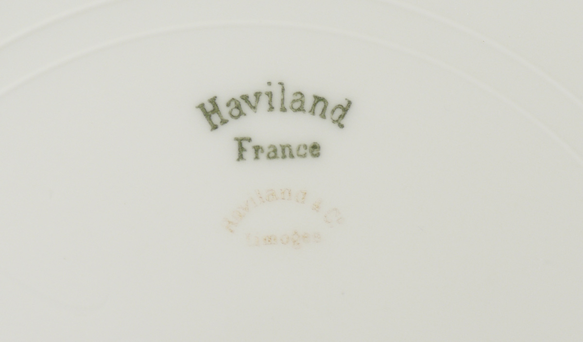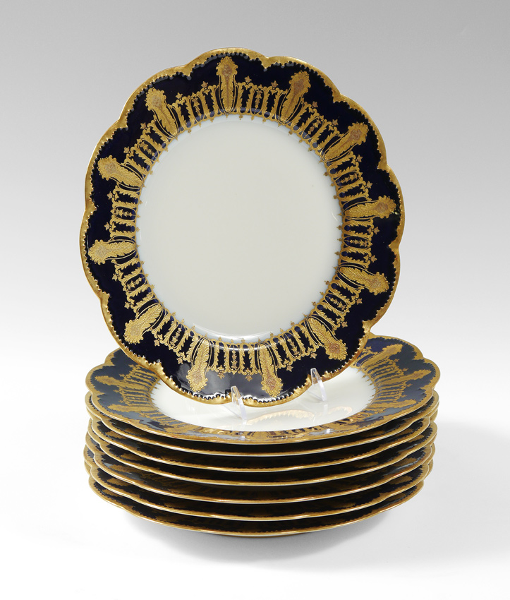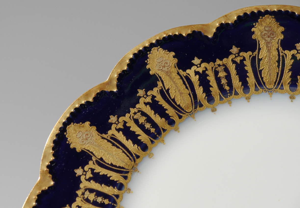 SET OF 8 LATE 19TH C FRENCH HAVILAND LIMOGES SERVICE PLATES: Haviland & Co. Elegant gold and cobalt border on white. Approx. 10'' dia.