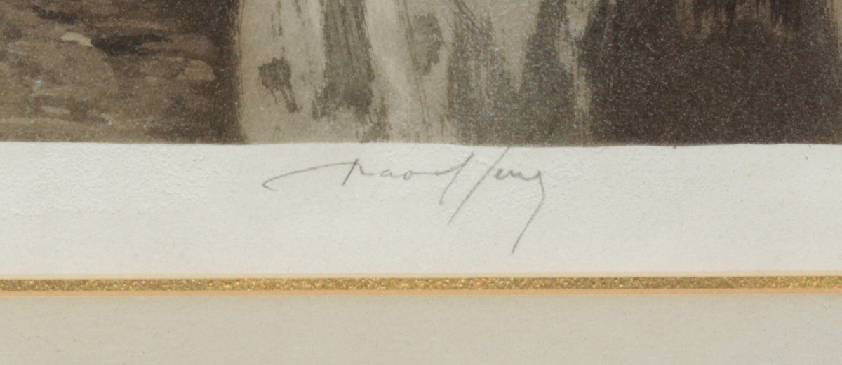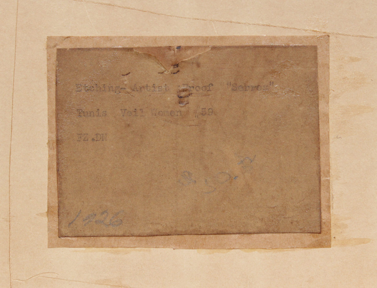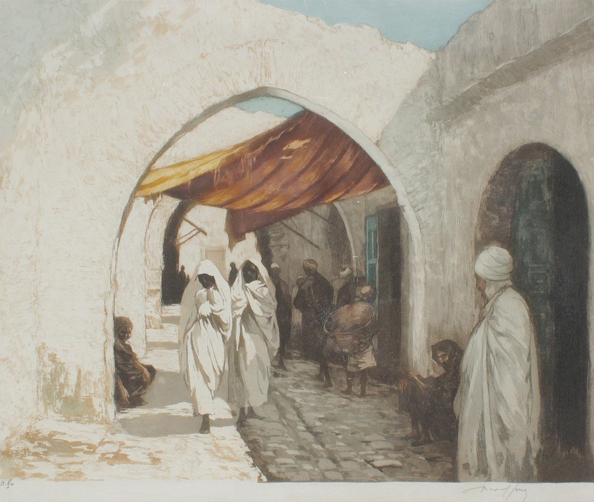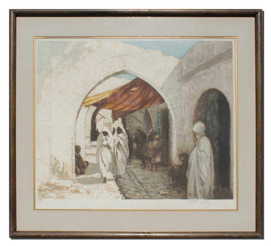 SERRES, Raoul, (French, 1881-1971): Middle Eastern Street Scene, ''Veil Women, #59'', Etching in Aquatint, Artist's Proof, Sight size 18 1/2'' x 22 1/2'', pencil signed lower right, illegible numbering lower left, original label affixed verso, publisher information copyright in the upper right margin, encased in later wood frame with wear 25'' x 29''.
