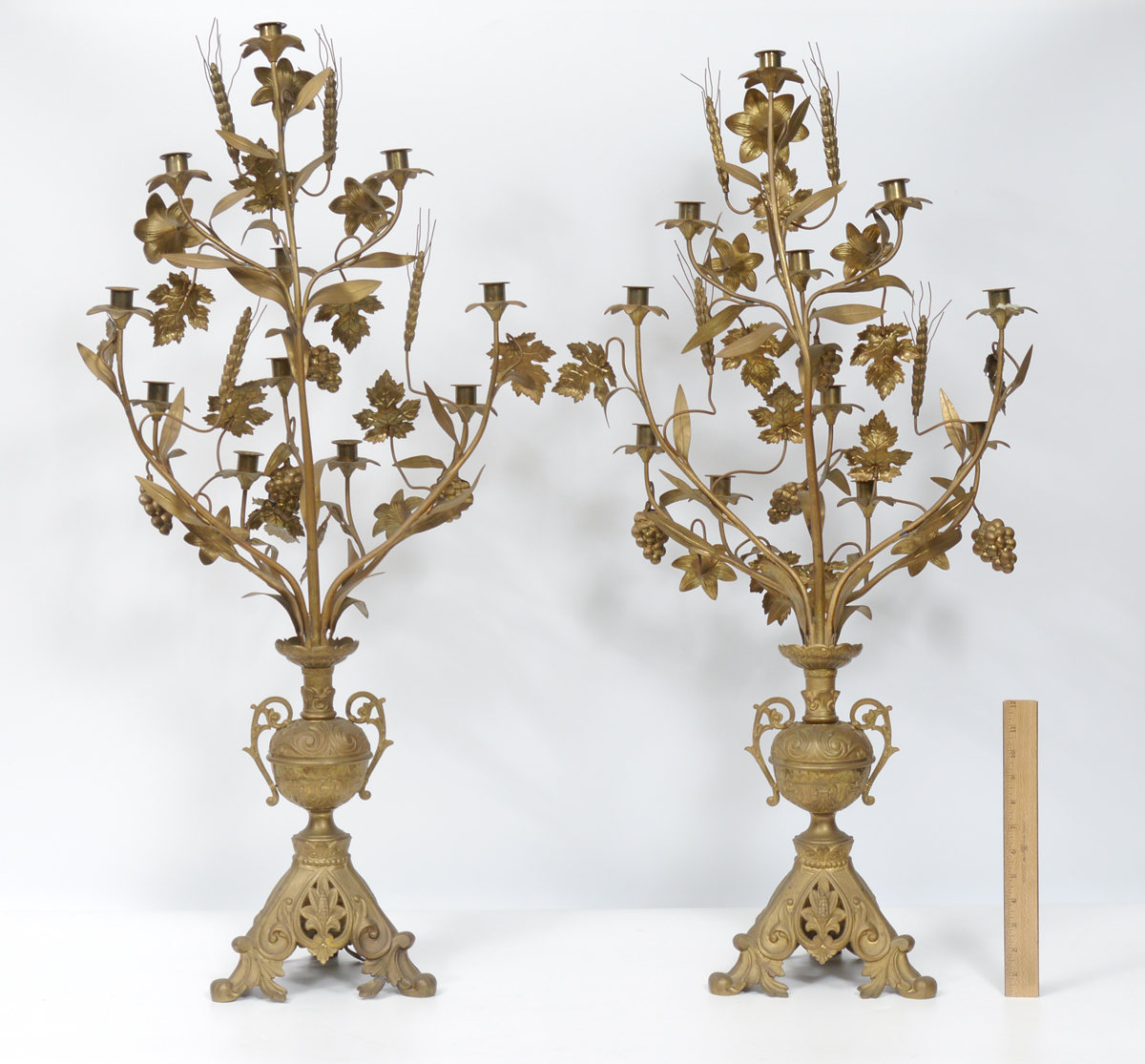 PAIR VICTORIAN FOLIATE MOTIF BRASS CANDELABRA: Cast brass with grape vine, wheat, and flowers. Heavy cast metal bases. Overall measures 38 1/4'' x 20 3/4'' x 12 1/2''.