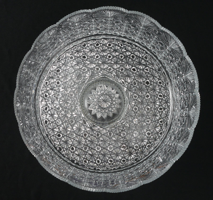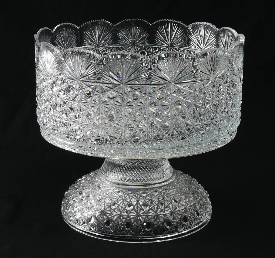 LARGE CUT GLASS PEDESTAL PUNCH BOWL: Bohemian cut glass, unmarked, very sharp teeth. 12 1/4'' h. x 13 1/4''.