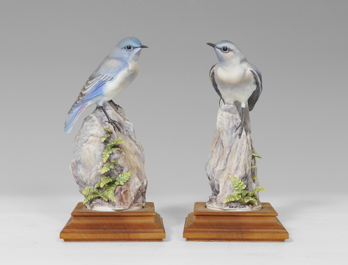 PAIR ROYAL WORCESTER DOROTHY DOUGHTY MOUNTAIN BLUEBIRDS: With Spleenwort Niger, measures 9 1/2'' tall, on wooden stand.