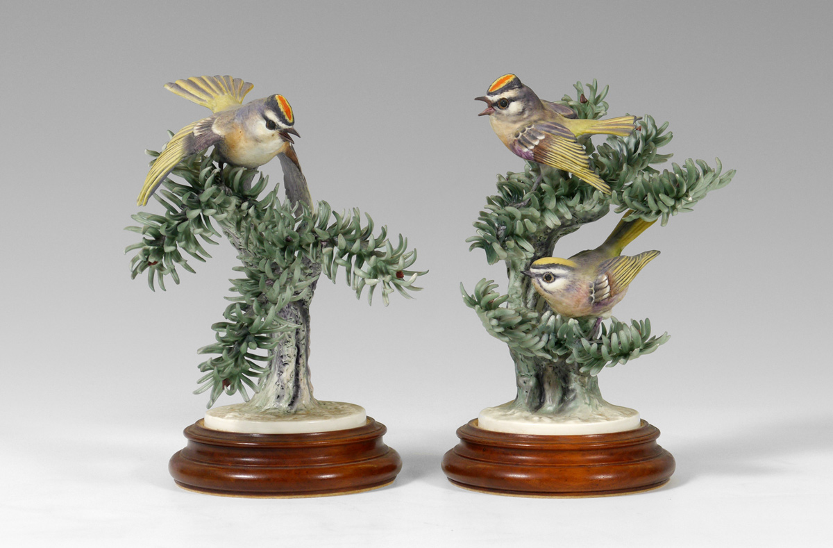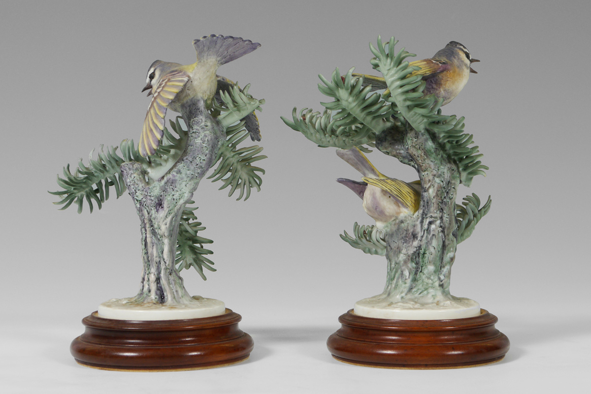 PAIR ROYAL WORCESTER DOROTHY DOUGHTY BIRDS, GOLDEN-CROWNED KINGLET: Sitting in greenery, on wooden stand, measures 8 1/2'' tall.