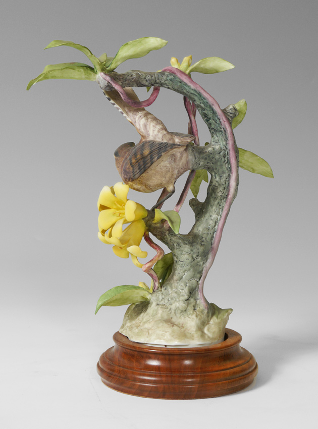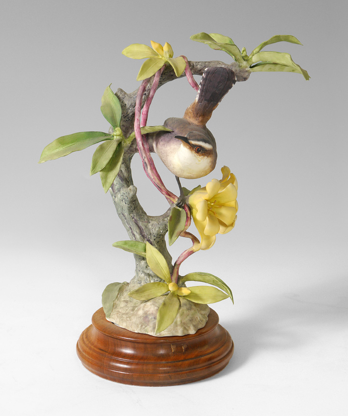 ROYAL WORCESTER DOROTHY DOUGHTY BIRDS BEWICKS WREN: Sitting on a branch with greenery, on a wooden stand, measures 9 1/2'' tall.