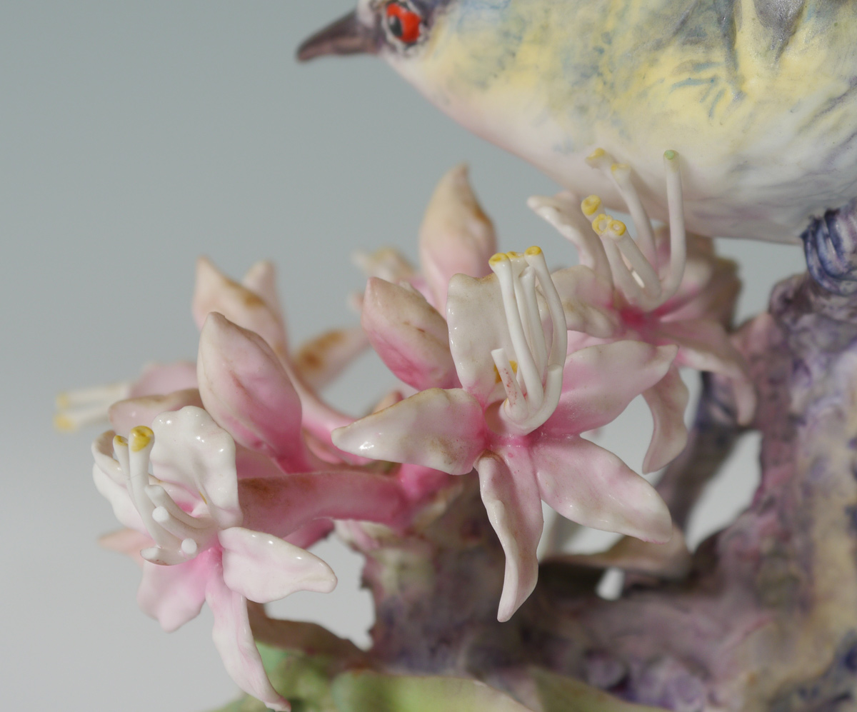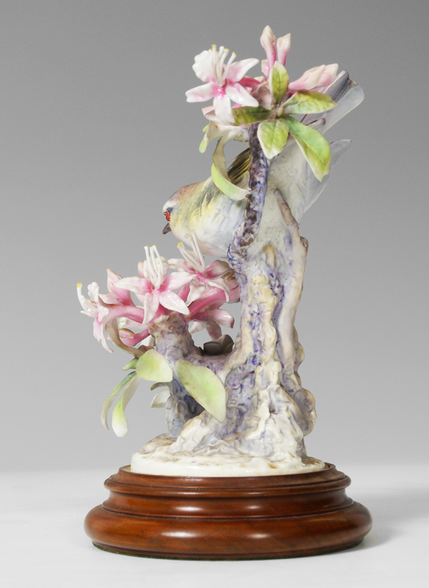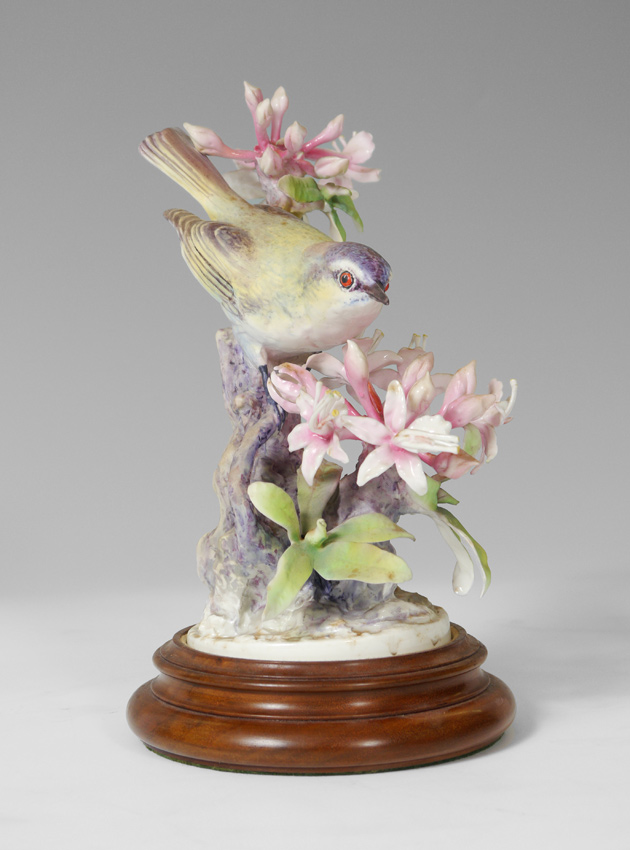 ROYAL WORCESTER DOROTHY DOUGHTY BIRD, RED EYED VIREO: Sitting on a branch enjoying nectar, on wooden stand, measures 8 3/4'' tall.