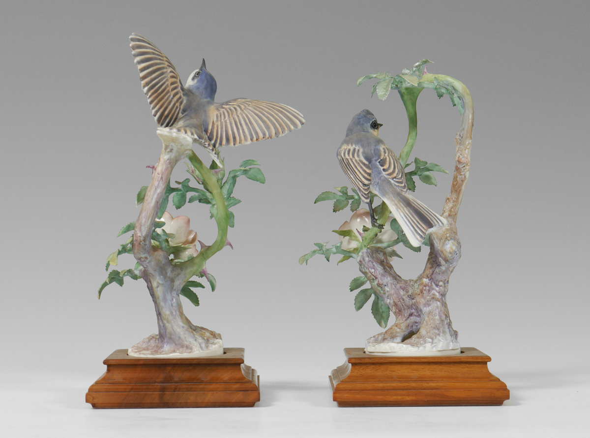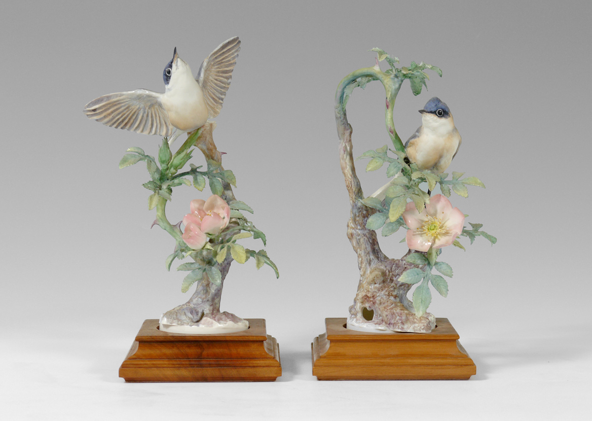 PAIR ROYAL WORCESTER DOROTHY DOUGHTY BIRDS, LESSER WHITE THROAT: With Wild Rose, measures approx. 10'' tall, on wooden stands.