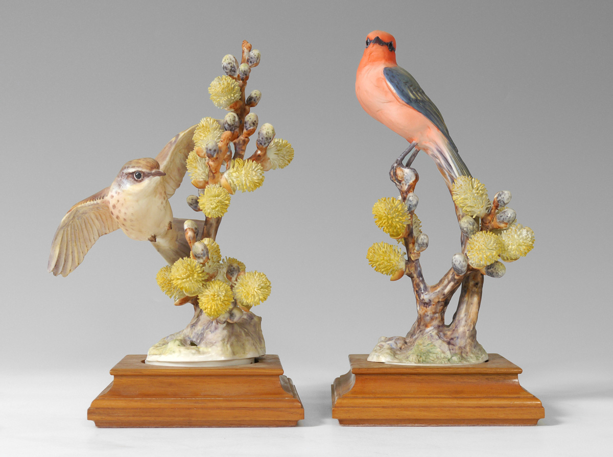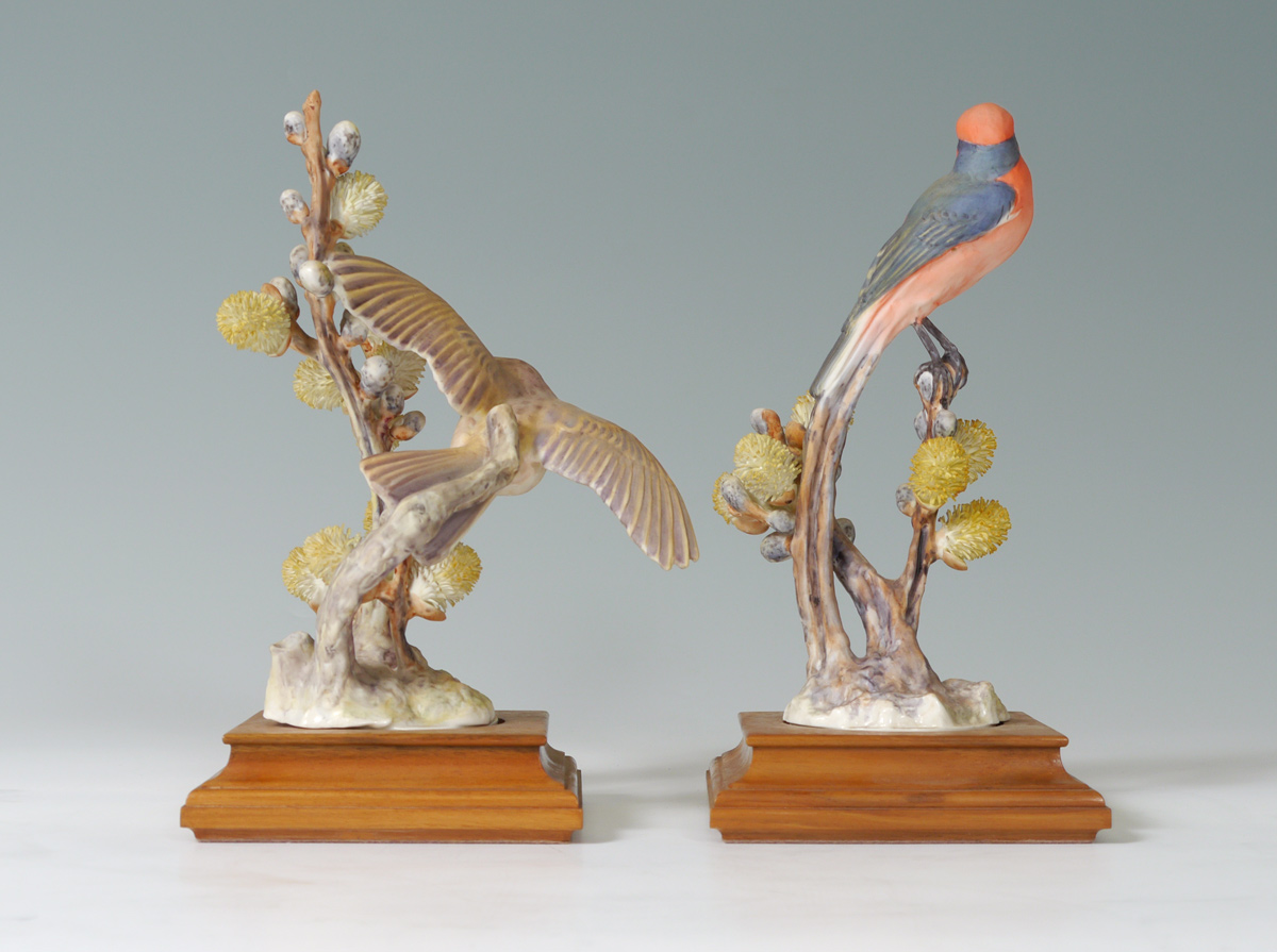 PAIR ROYAL WORCESTER DOROTHY DOUGHTY BIRDS, VERMILION FLYCATCHER: With Pussy Willows, on wooden stands, tallest measures 10'' tall.
