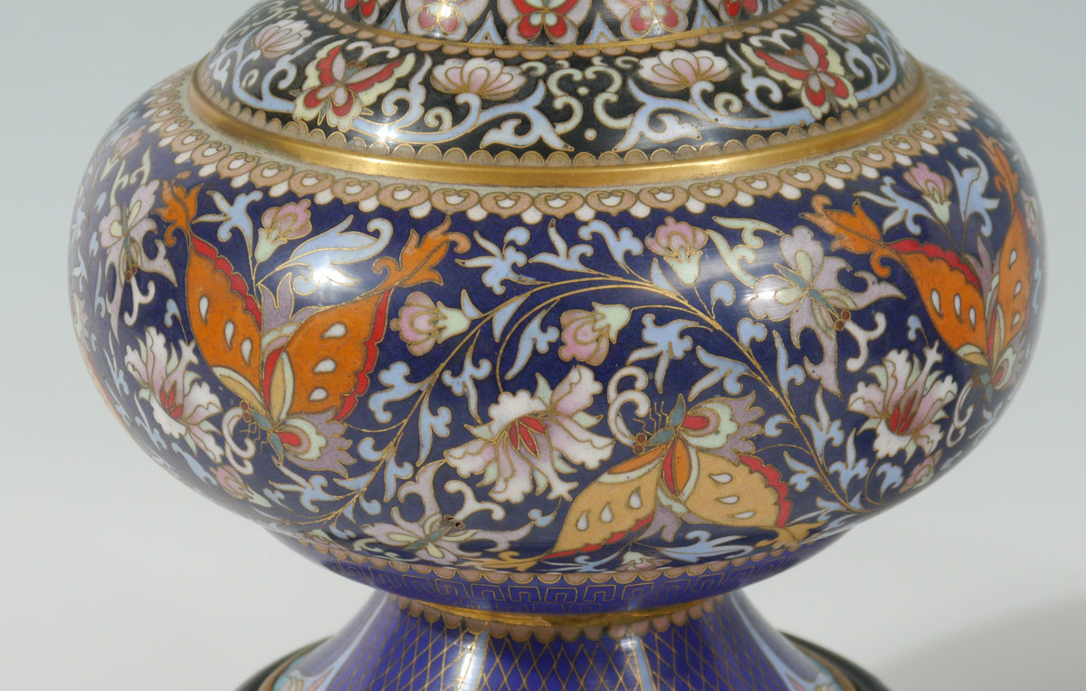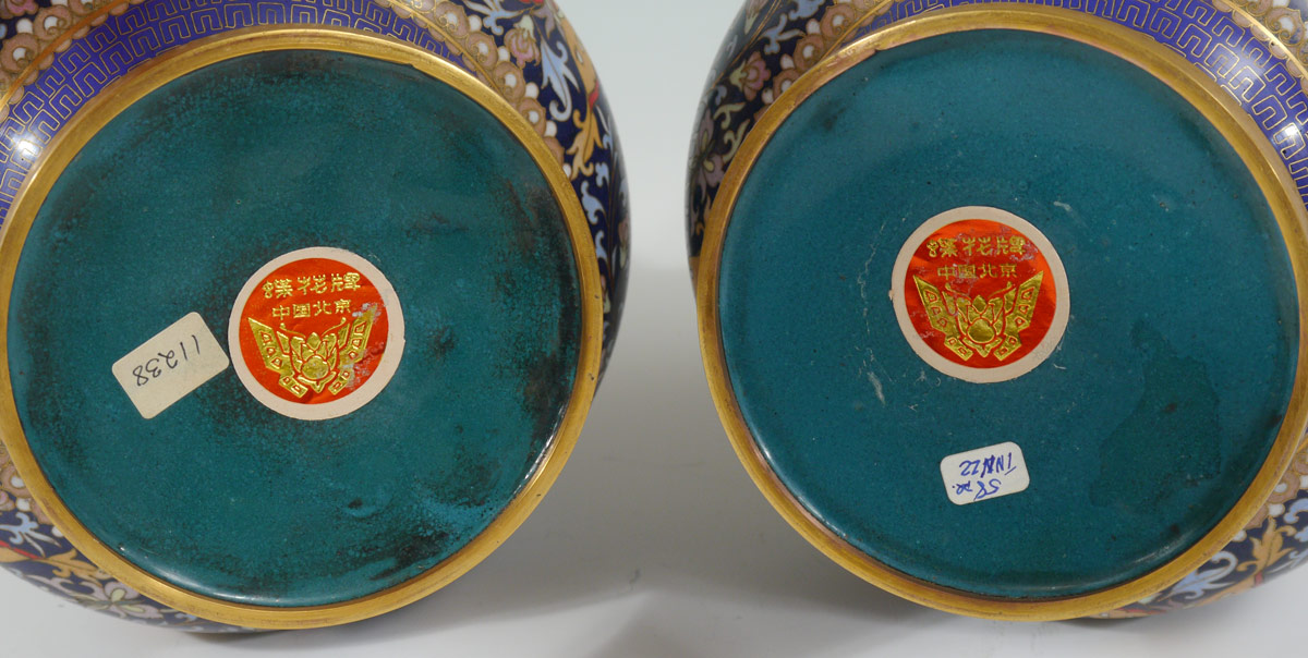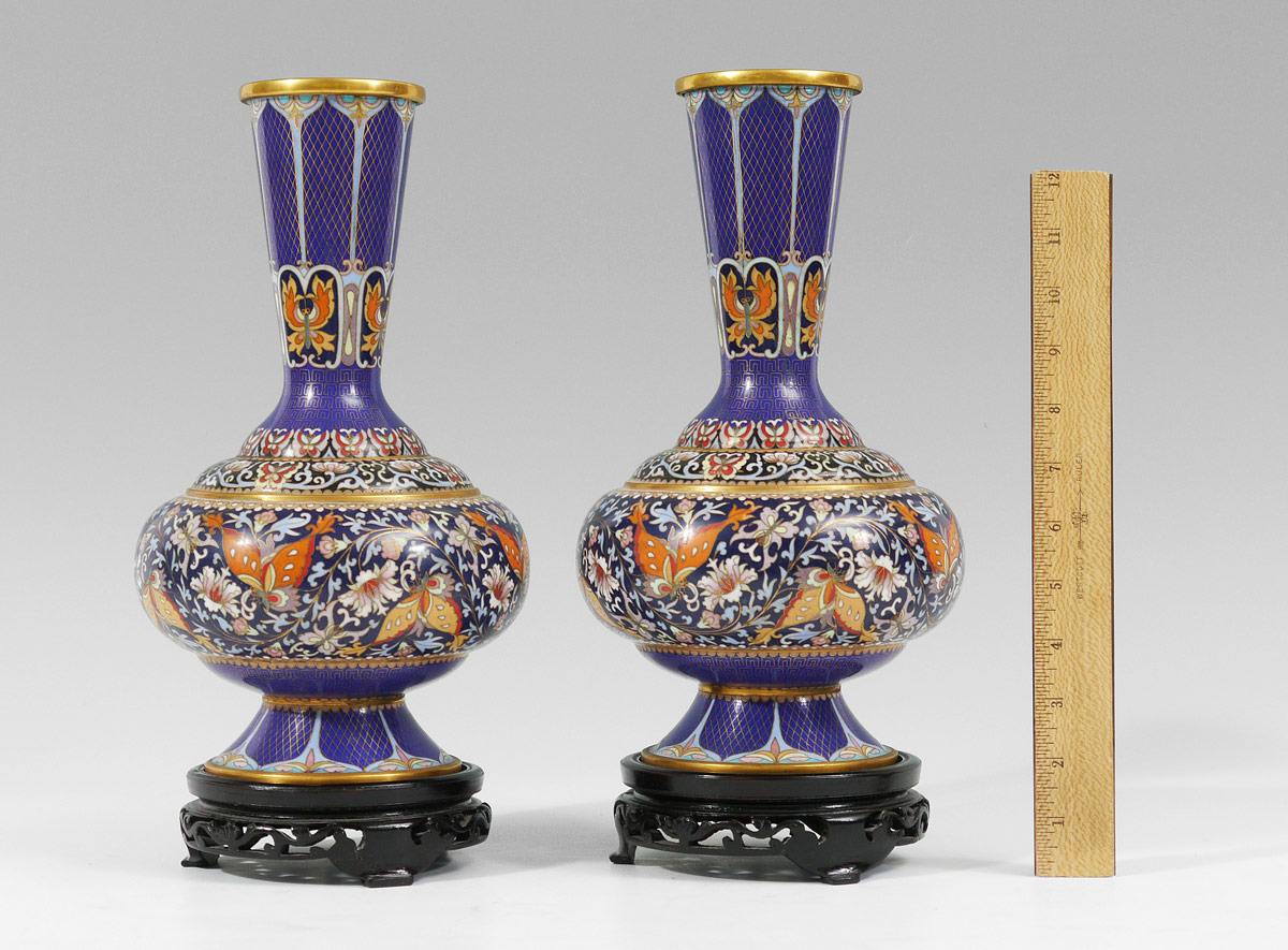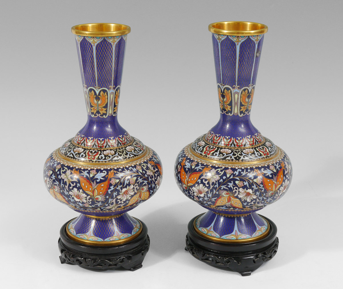 PAIR 12'' BUTTERFLY MOTIF CHINESE CLOISONNE VASES: Contemporary, cobalt blue ground with butterfly, floral and geometric motifs. Foil label on base. 12'' h. x 7''. Sold with carved wood stands, 1 7/8'' h. x 5 1/2''.