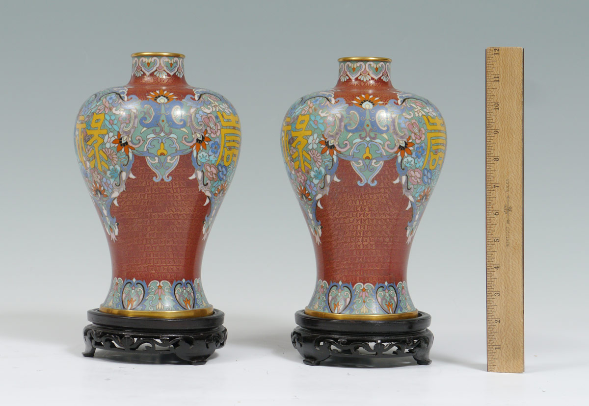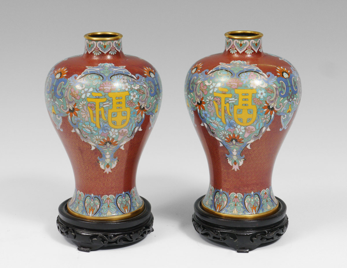 PAIR 10'' FLORAL DESIGN CHINESE CLOISONNE VASES: Contemporary, ox blood ground with floral, symbols and geometric motifs. Foil label on base. 10 1/4'' h. x 6 1/2'' dia. Sold with carved wood bases, 1 3/4'' h. x 5 5/8'' dia.