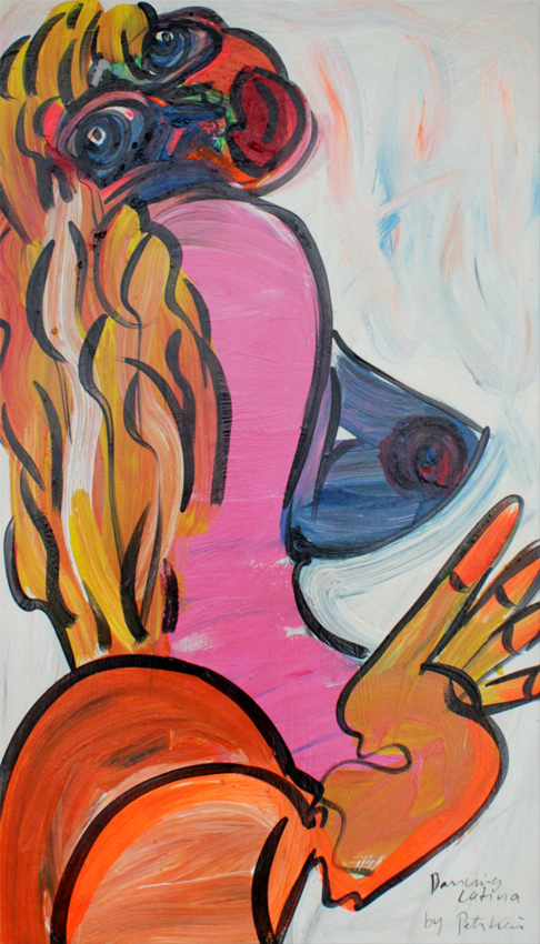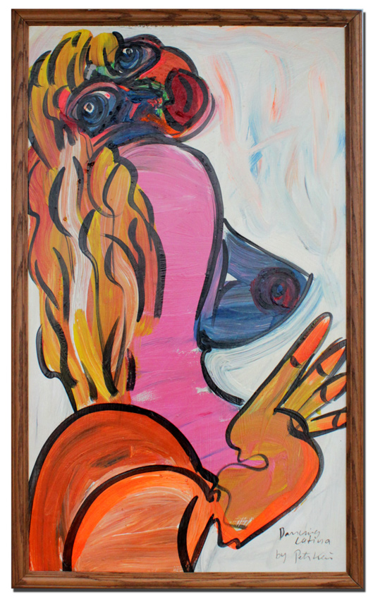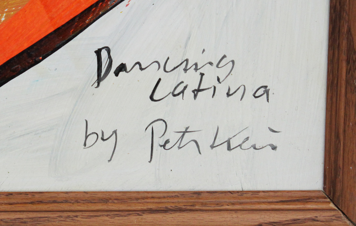 KEIL, Peter, (German, 1942- ): ''Dancing Latina'', Oil/Masonite, 39 1/2'' x 23 1/2'', signed and titled lower right, signed and titled verso, wooden frame with wear 42'' x 26''.