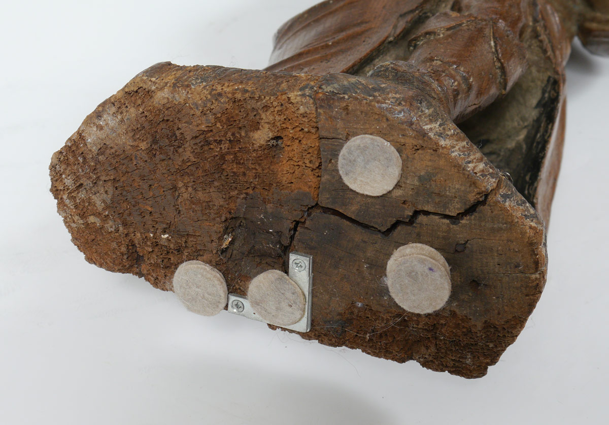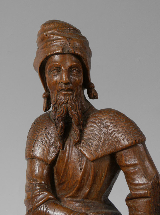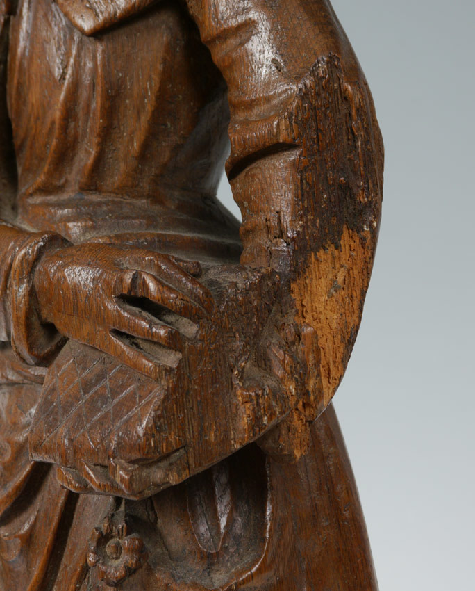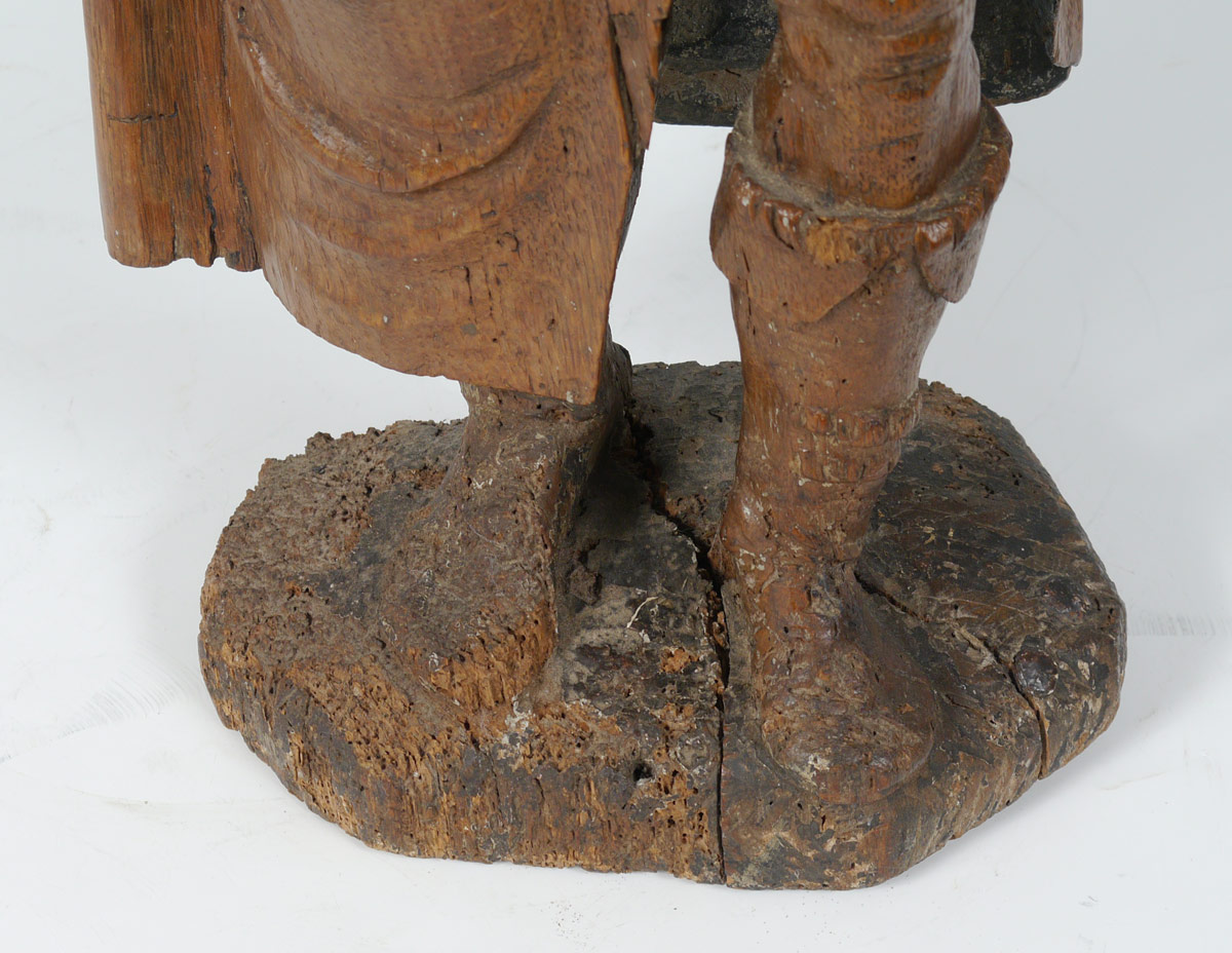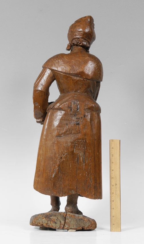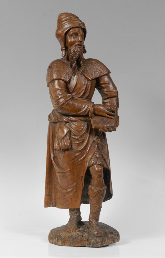 EARLY CARVING OF A SCHOLAR: Wood carving of a standing scholarly European man holding a book. Actual age unknown. Measures 29 1/2'' h. x 9 1/2'' x 5 1/4''.