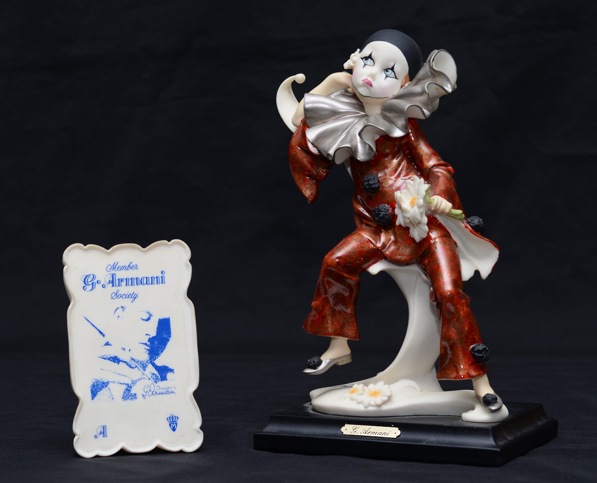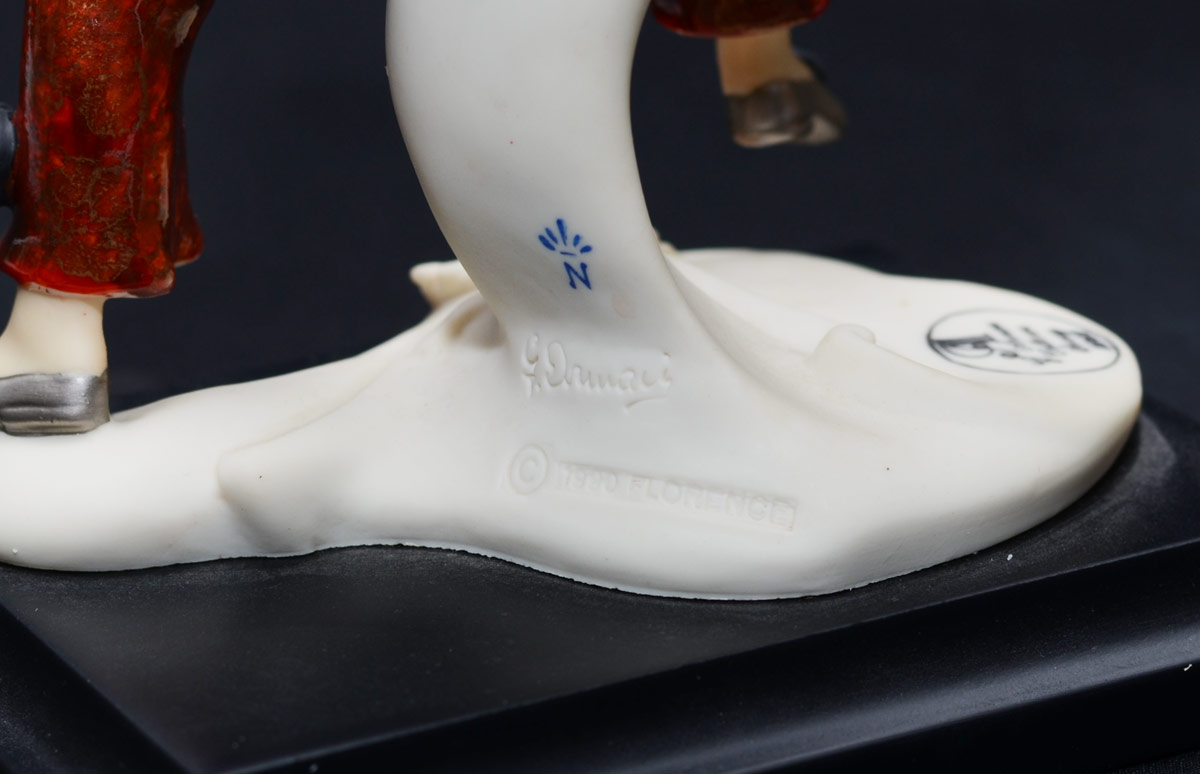 GIUSEPPE ARMANI SOCIETY MEMBER EXCLUSIVE COLLECTIBLES: 1991 ''RUFFLES'', #745 E, ''Florence sculture d'arte'' Made in Italy, 9 1/2''h., with box and coa; and the G.Armani Member Society advertising sign, 4 1/2''h., no box.