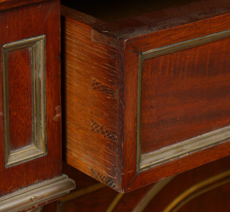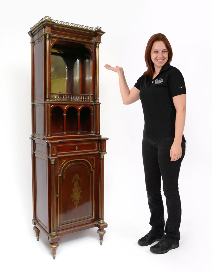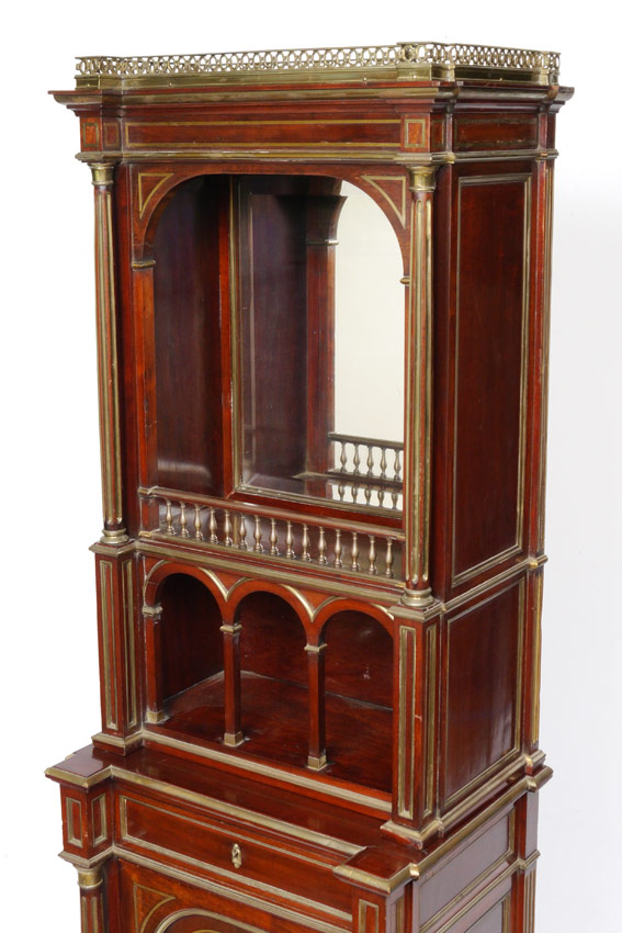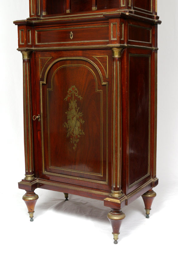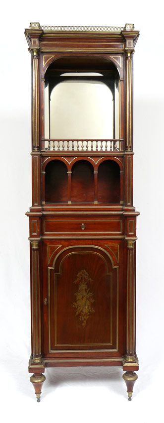 NAPOLEON III BOULLE INLAY FRENCH MAHOGANY CABINET: Top with brass pierced gallery, inlaid brass trim, open shelf with mirrored beveled glass interior, full column supports, over arched opening lower shelf. Base with single drawer over single door with inlaid boulle decoration of garland, flowers and musical instruments. On 4 shaped feet. Measures 69 1/2'' h. x 21 1/2'' x 14 1/4''.