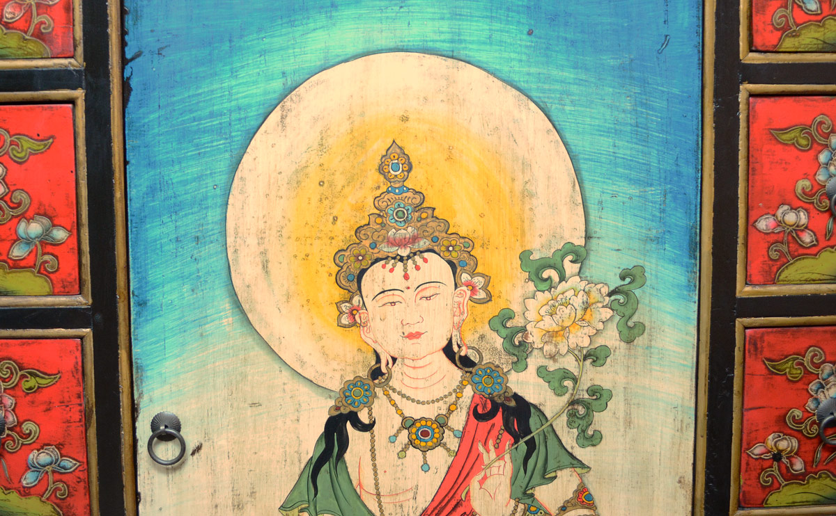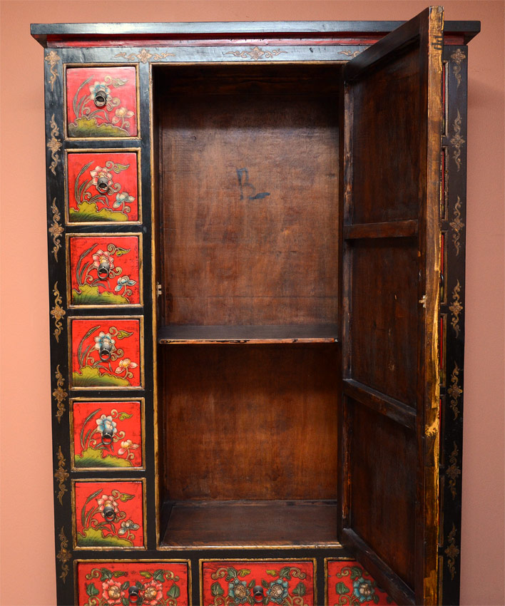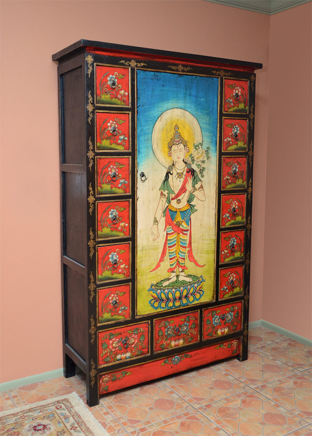 PAINT DECORATED ASIAN MULTI DRAWER CUPBOARD: Paint decorated all over with central door featuring standing Buddha holding lotus blossom. Door surrounded by 15 drawers, sides and below. Actual age unknown. Measures 73 1/2'' x 46 1/2'' x 17 1/4''.