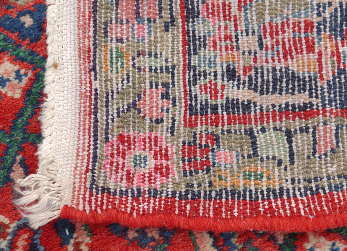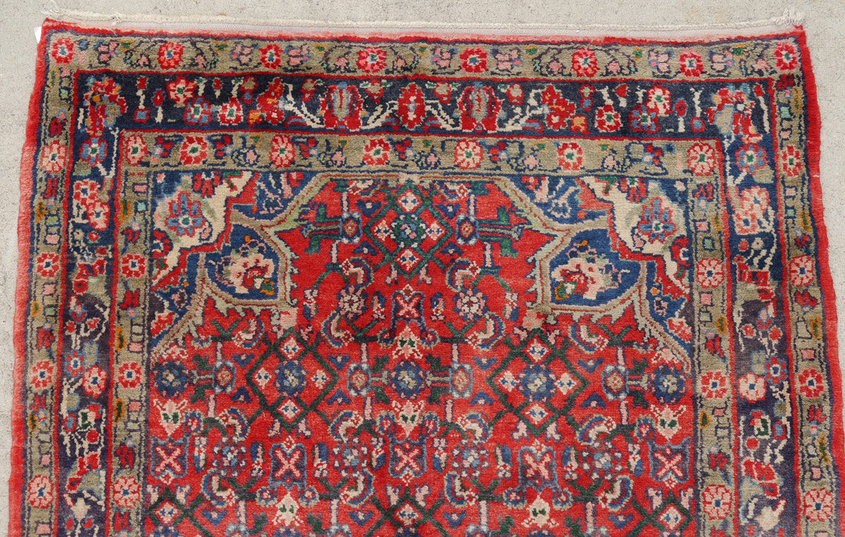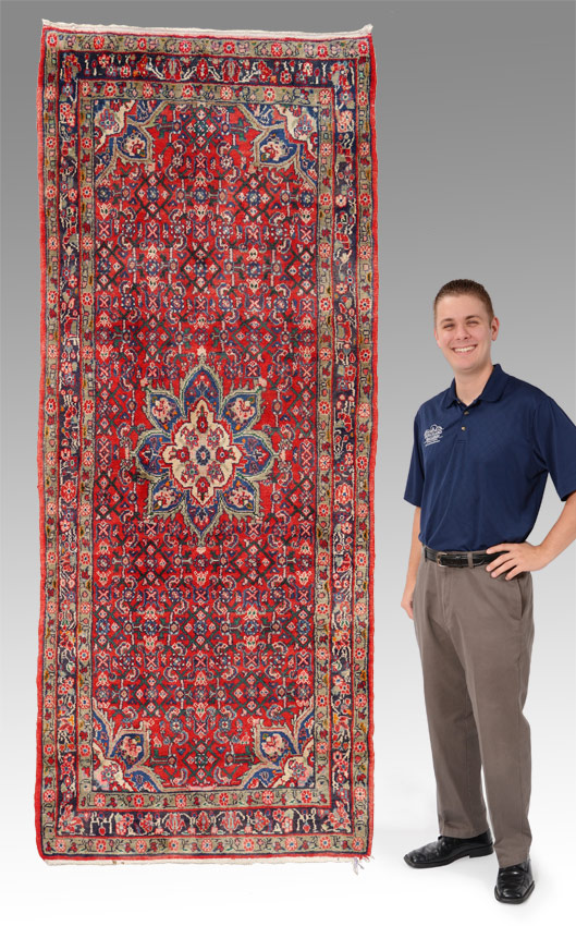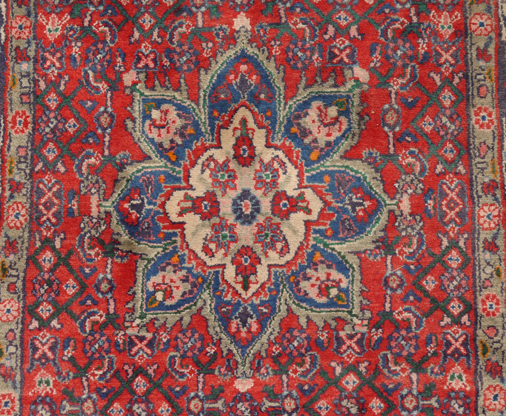 APPROX. 45-75 YR. OLD N. W. PERSIAN HAND KNOTTED WOOL RUG, 3'9'' x 8'8'': This shape rug is often referred to as a corridor or gallery rug since those are the places this rug would fit nicely. The red ground has a small central medallion and four corners that are four quarters of the medallion. The rest of the field is covered with a small repeating pattern done in colors of blue, green, ivory, and peach. Condition is good.