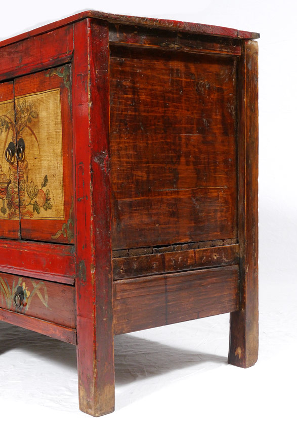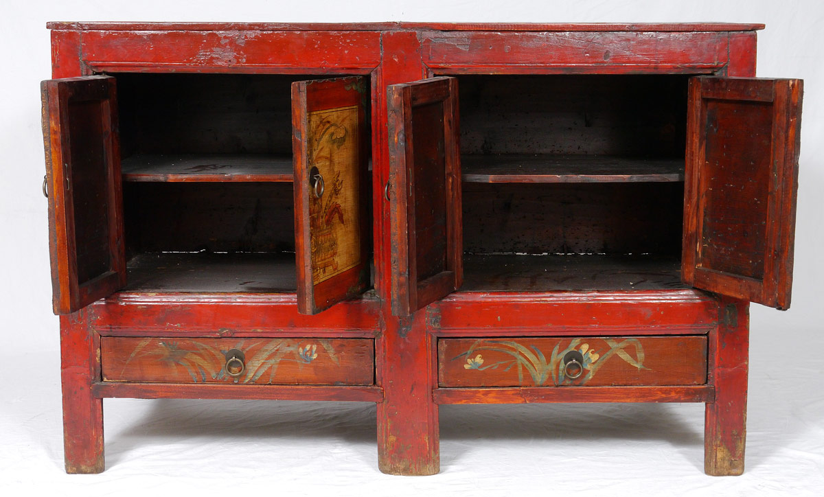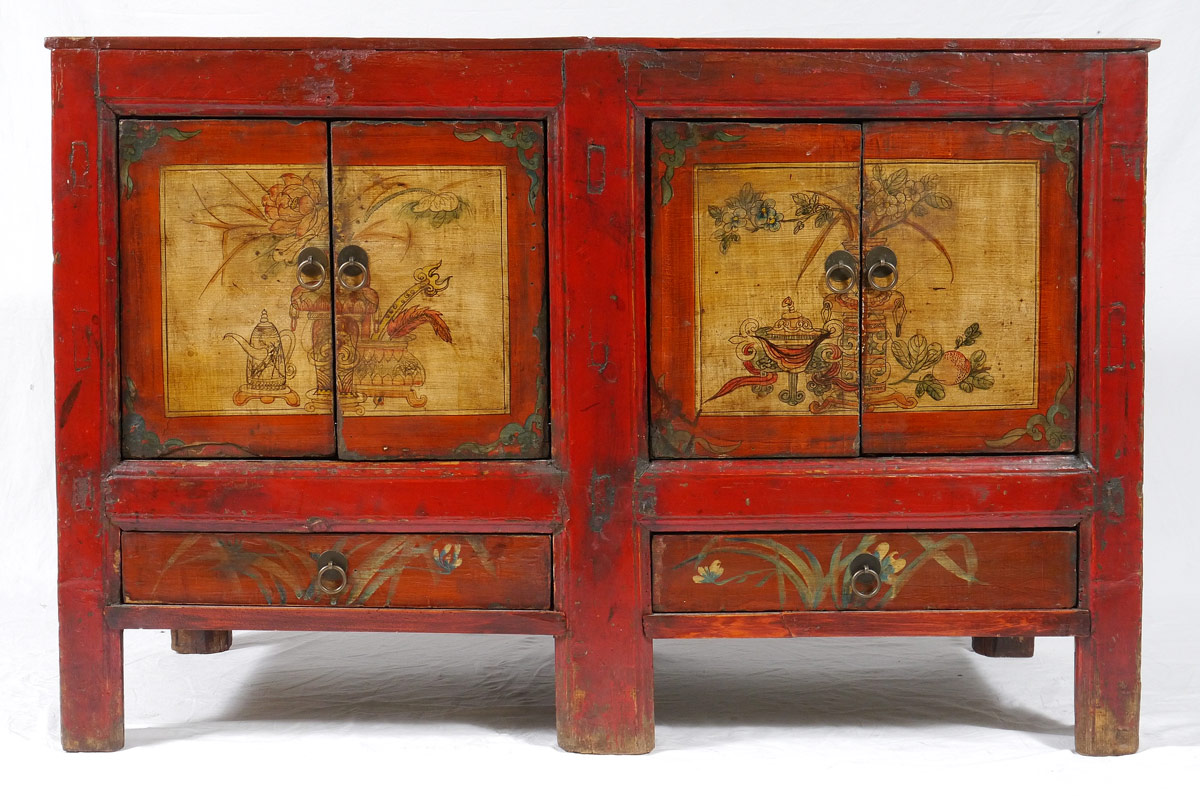 TIBETAN LACQUERED AND PAINTED CABINET: Four doors over 2 half length drawers. Rich red lacquer with paint decorated doors. Measures approx. 33'' tall x 50 1/2'' x 20 1/2''.